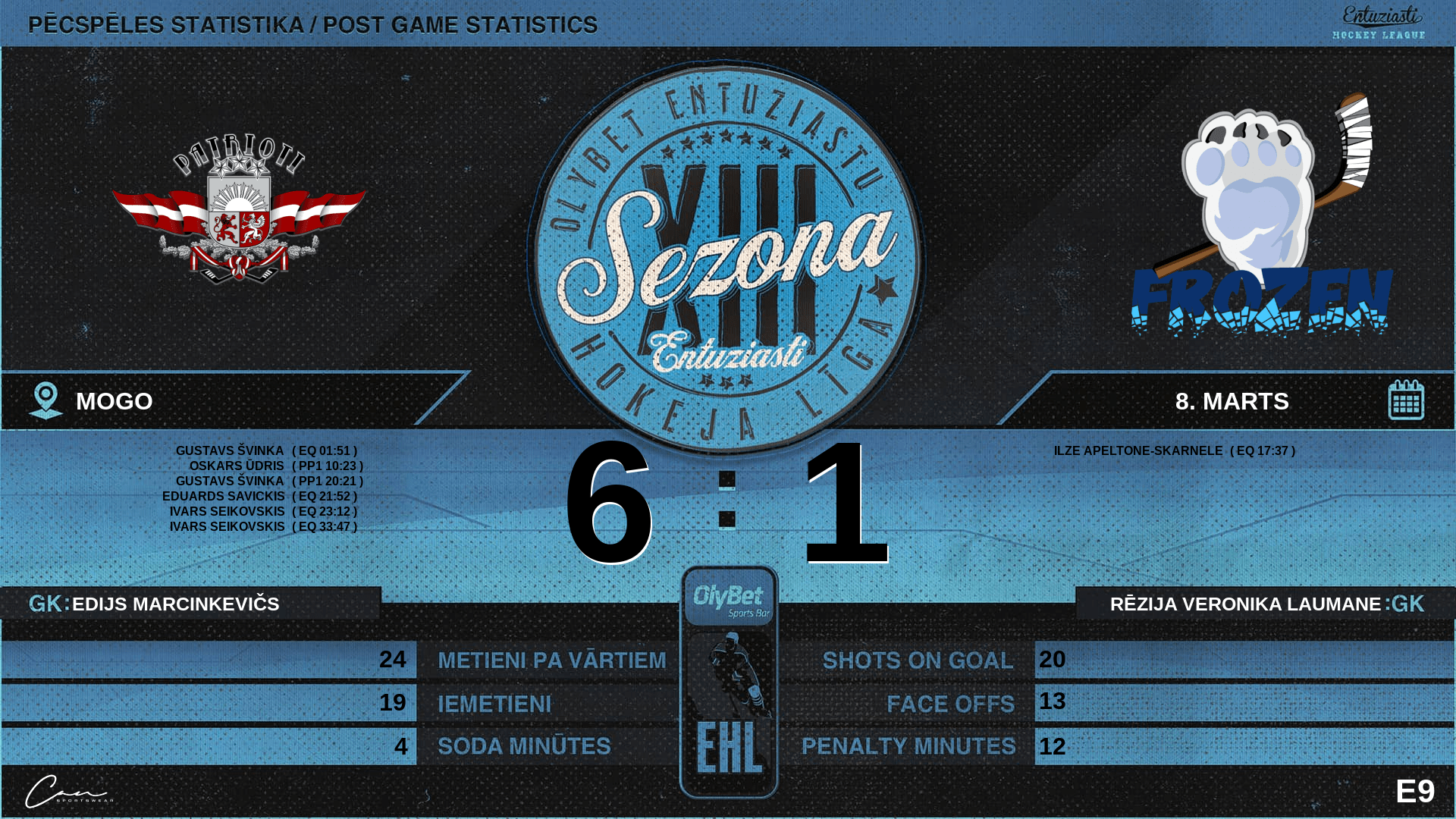 | 23:12 | PT3 | Vārti (EQ) | #7 Ivars Seikovskis, piespēles: #97 Ritvars Zēbergs - Lejnieks |