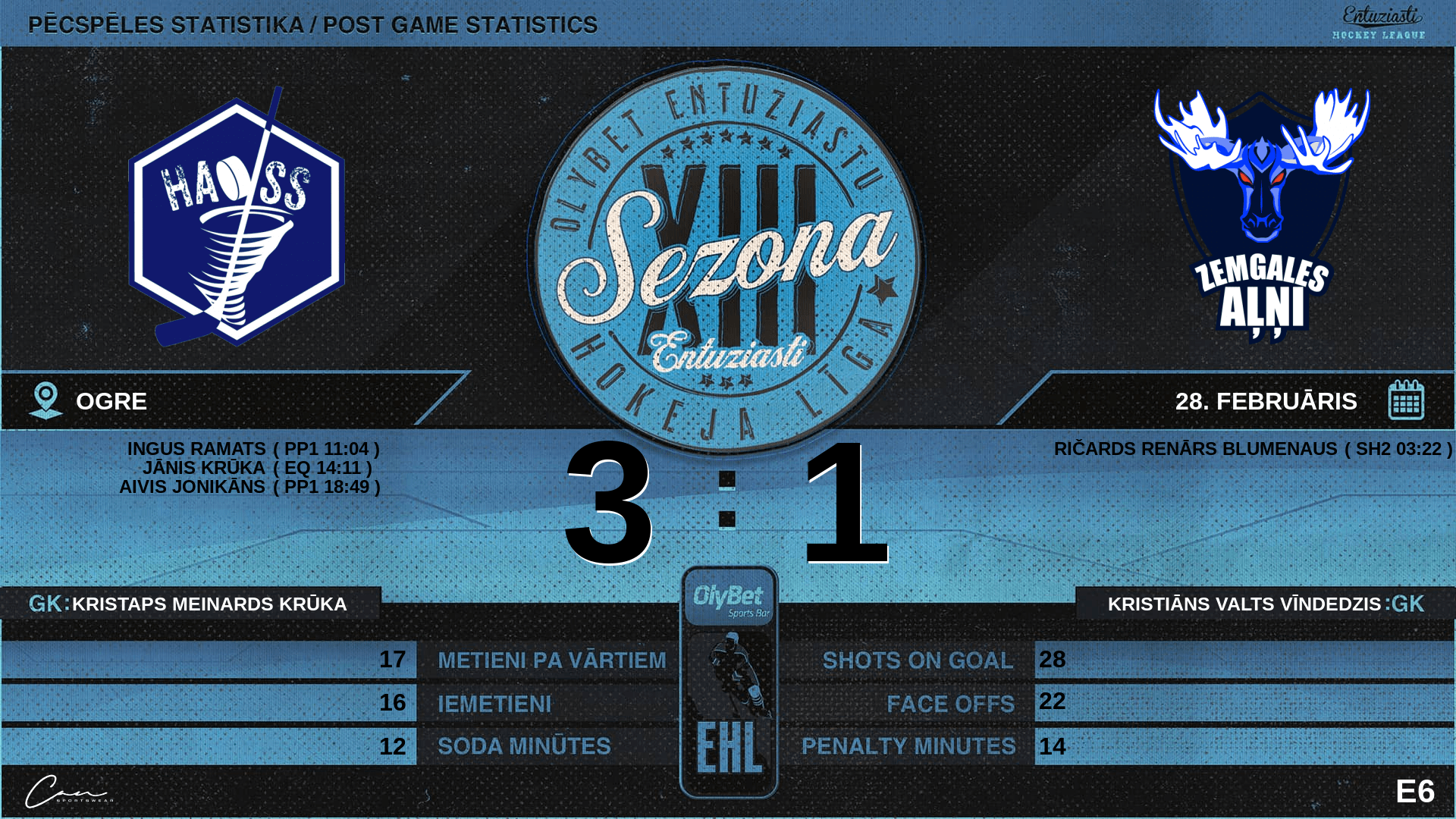 | 11:04 | HAS | Vārti (PP1) | #34 Ingus Ramats, piespēles: #52 Aivis Jonikāns |
