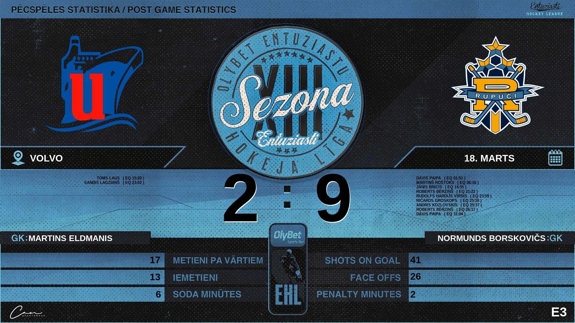 | 31:04 | RPC | Vārti (EQ) UNI 2 : 9 RPC | #13 Kaspars Freimanis, piespēles: #11 Ēriks Guģis |