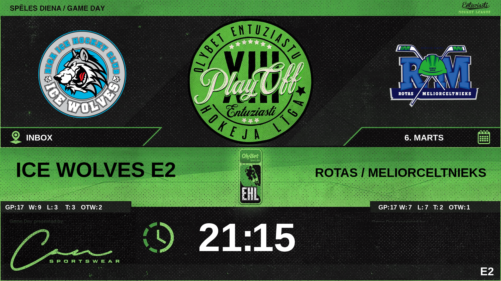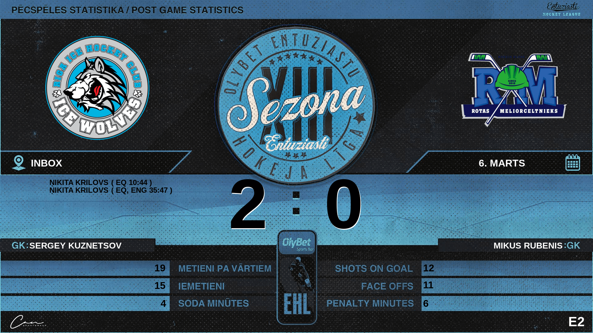 | 35:47 | WLF | Vārti (EQ, ENG) WLF 2 : 0 RTS | #75 Ņikita Krilovs, piespēles: #42 Reinis Vītoliņš, #58 Karnei Zhytnik |