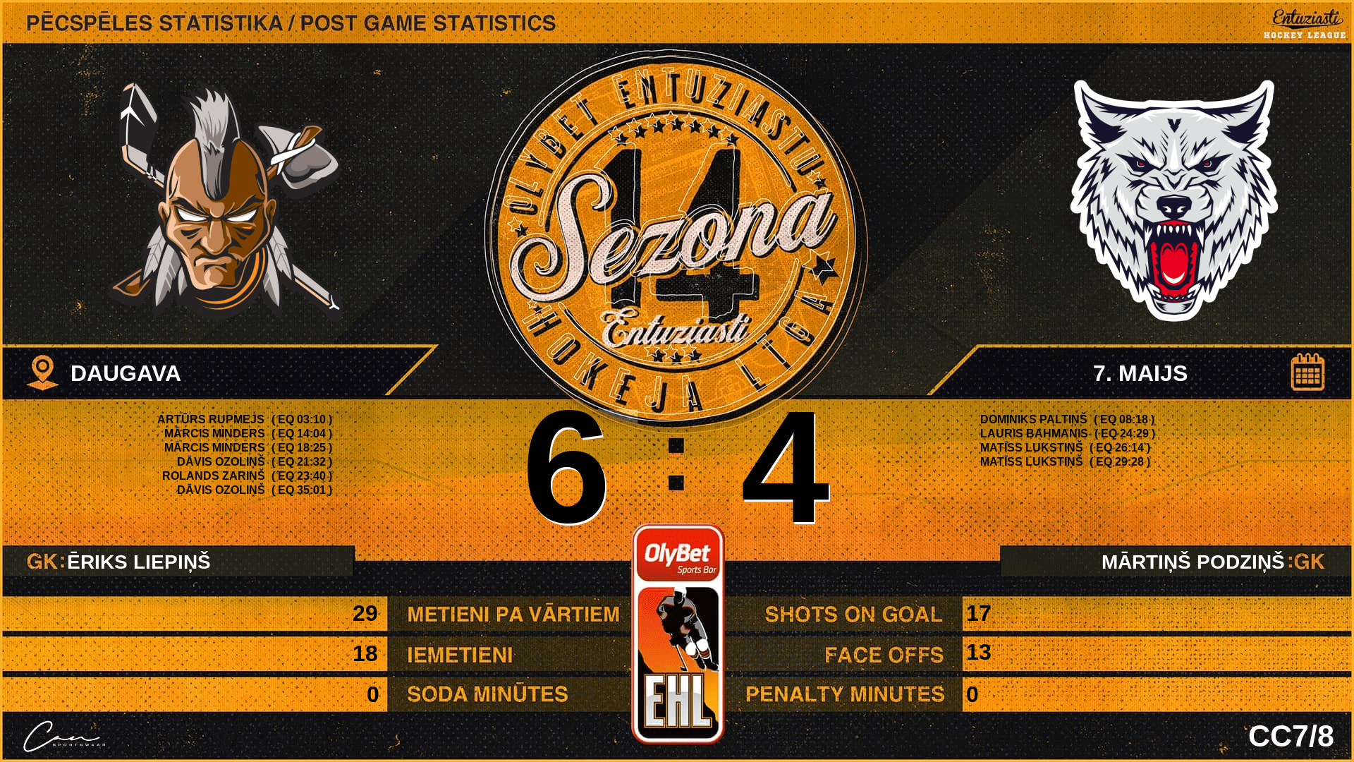 | 03:10 | MZ2 | Vārti (EQ) | #28 Artūrs Rupmejs, piespēles: #4 Sandis Nīlenders-Neilanders, #70 Matīss Matigars Ezeriņš |