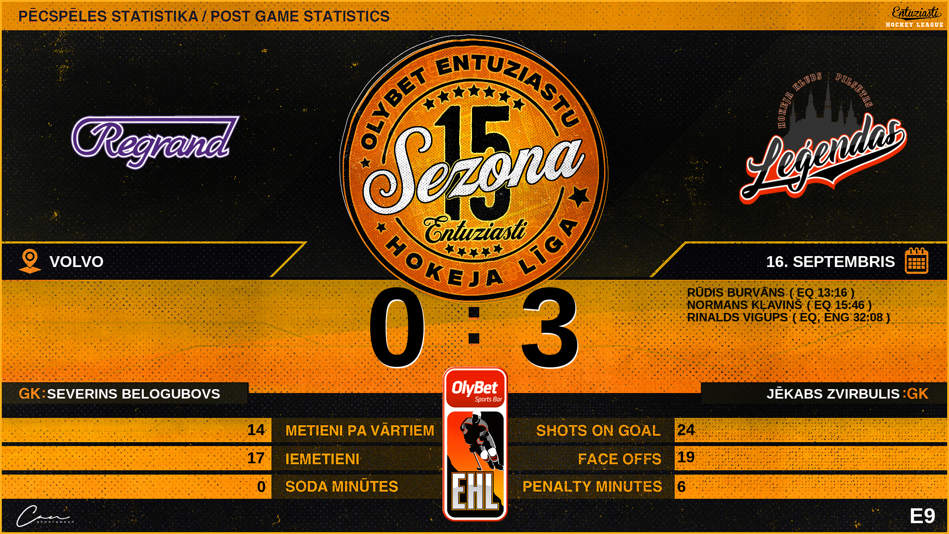 13:16 | PL9 | Vārti (EQ) | #23 Rūdis Burvāns, piespēles: #37 Jēkabs Grigorjevs, #2 Ivo Rundzāns |