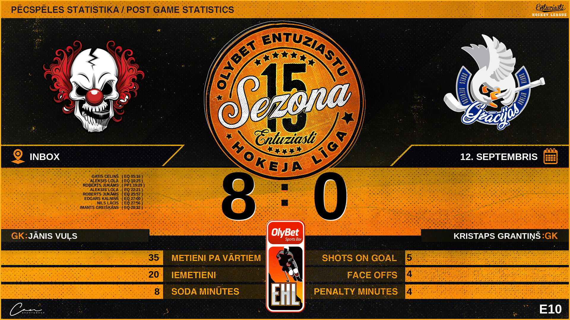 10:25 | CR2 | Vārti (EQ) | #35 Aleksis Loļa, piespēles: #7 Elvijs Endelis, #78 Kristaps Krūka |