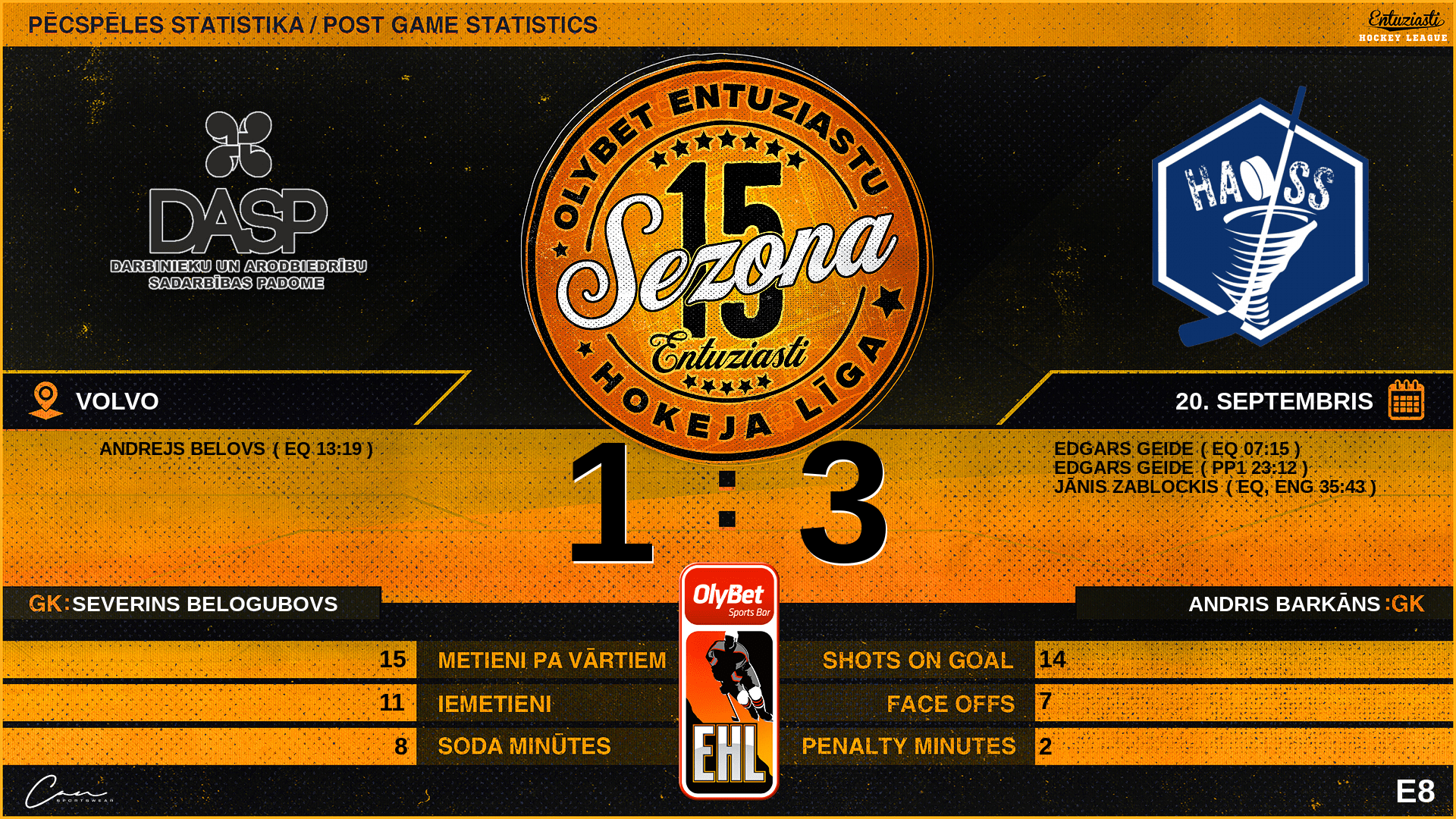 13:19 | DAS | Vārti (EQ) | #35 Andrejs Belovs, piespēles: #17 Pāvels Romaņuks |