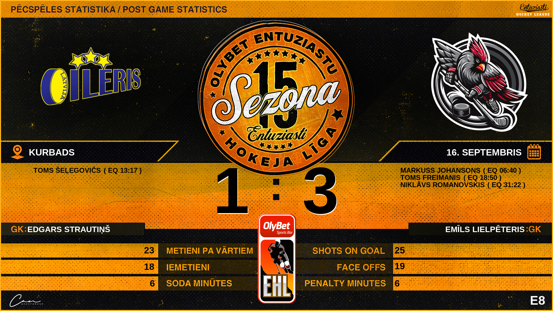 13:17 | OLR | Vārti (EQ) | #35 Toms Šeļegovičs, piespēles: #15 Matīss Rīders |