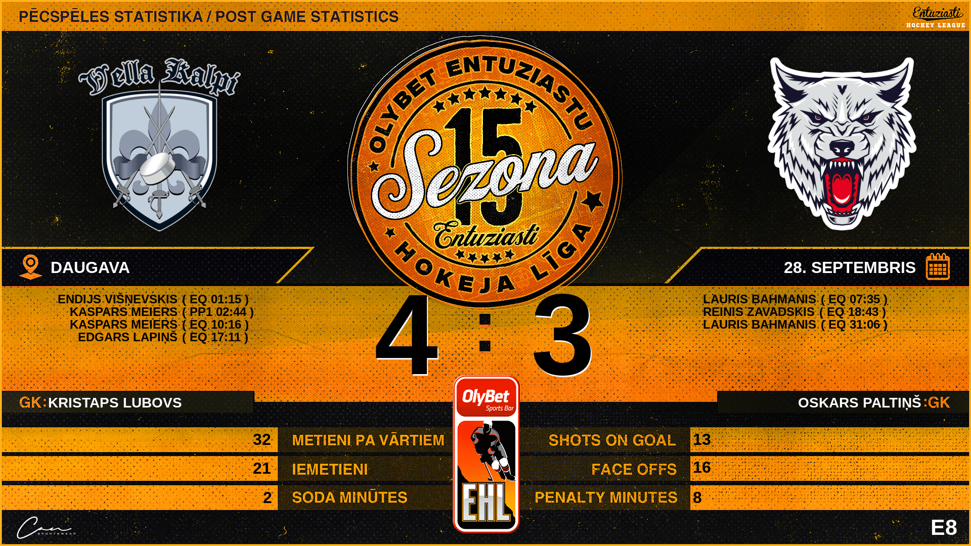 17:11 | VKL | Vārti (EQ) | #77 Edgars Lapiņš, piespēles: #81 Kārlis Bļodnieks |