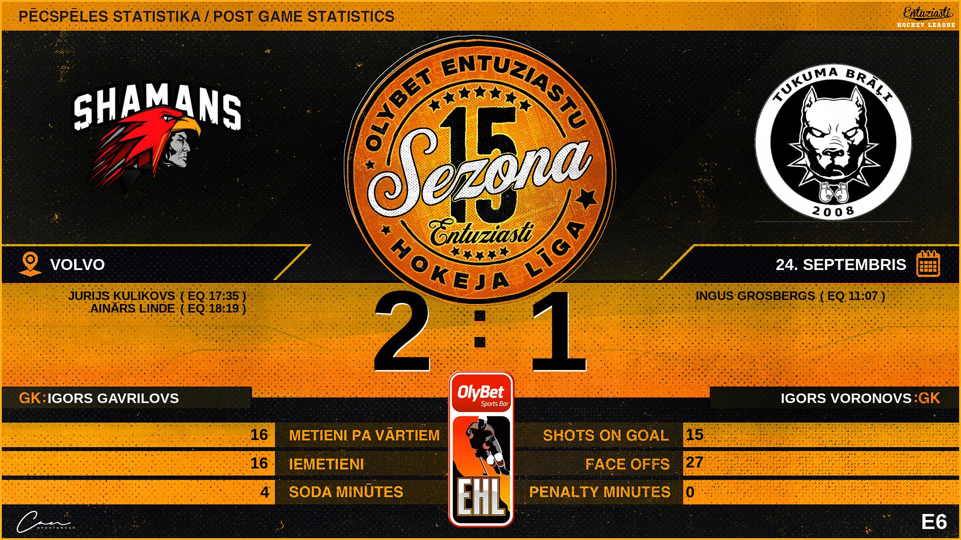 17:35 | SHM | Vārti (EQ) | #24 Jurijs Kulikovs, piespēles: #15 Sergejs Sirkins |