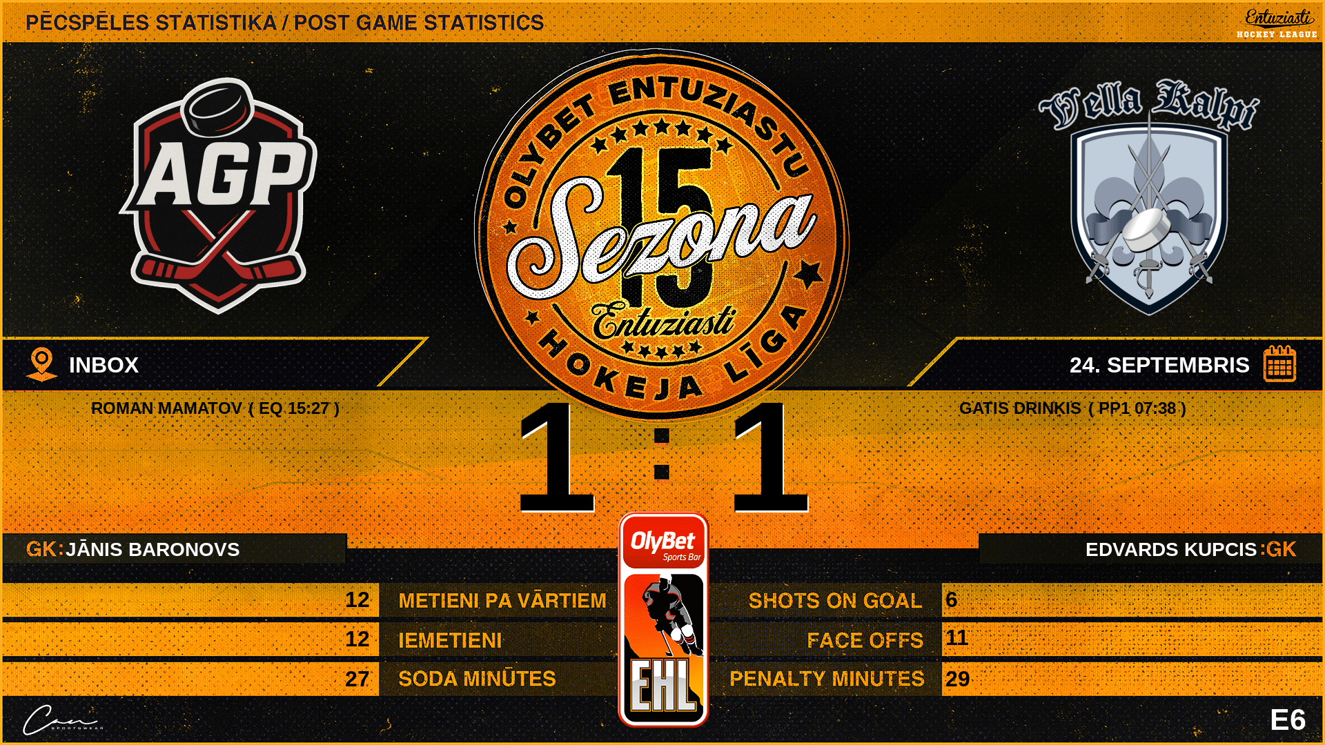 15:27 | AGP | Vārti (EQ) | #92 Roman Mamatov, piespēles: #55 Arturs Saldenieks, #33 Roberts Altenzels |