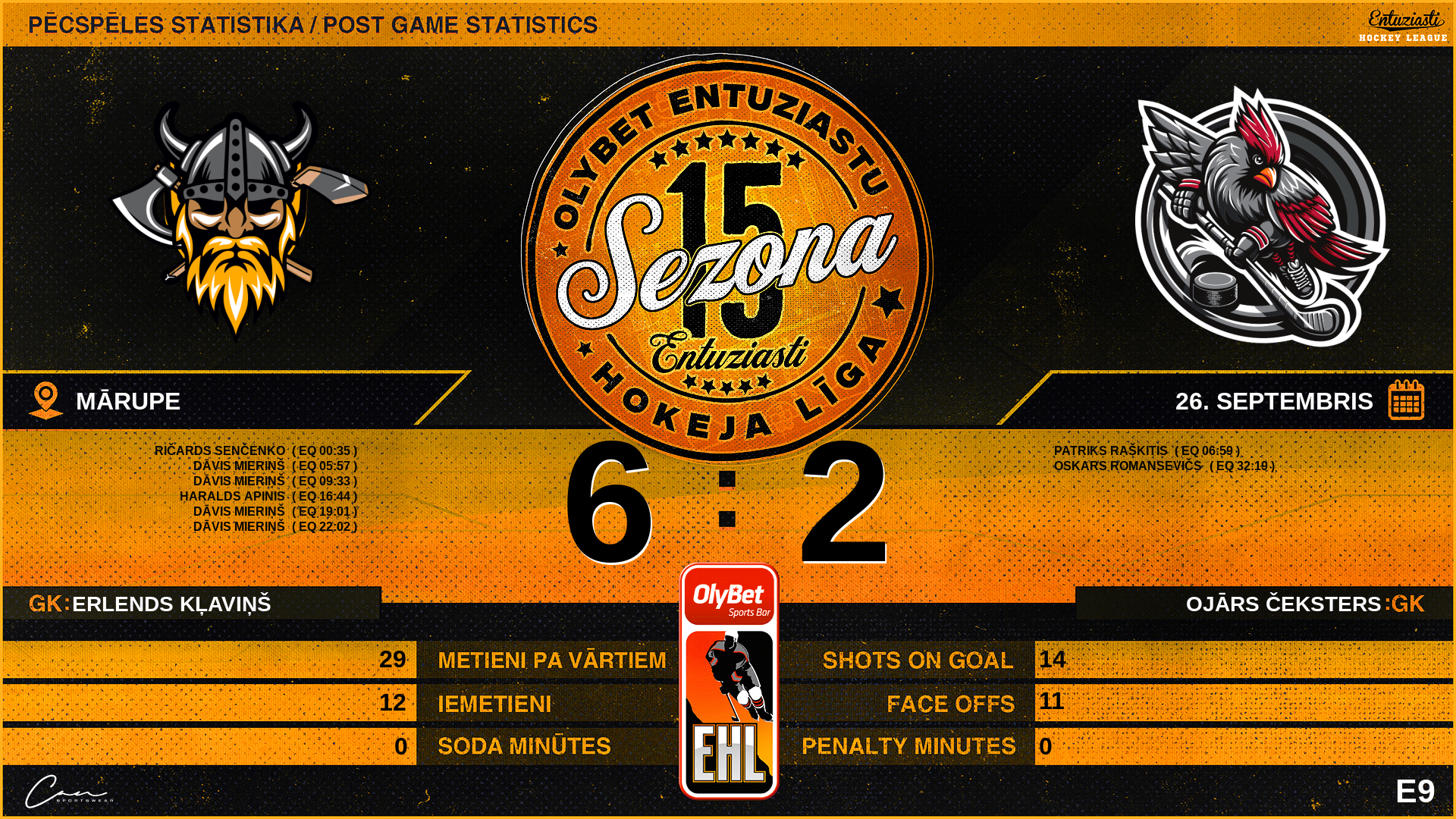 19:01 | VN3 | Vārti (EQ) | #17 Dāvis Mieriņš, piespēles: #68 Dāvis Cēderštrēms, #4 Gatis Rimša |