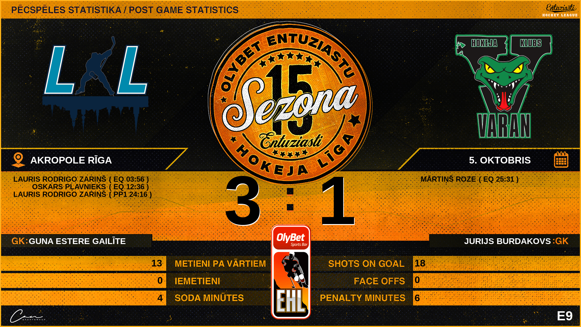 12:36 | LLS | Vārti (EQ) | #67 Alberts Šakels, piespēles: #97 Lauris Rodrigo Zariņš, #53 Oskars Pļavnieks |
