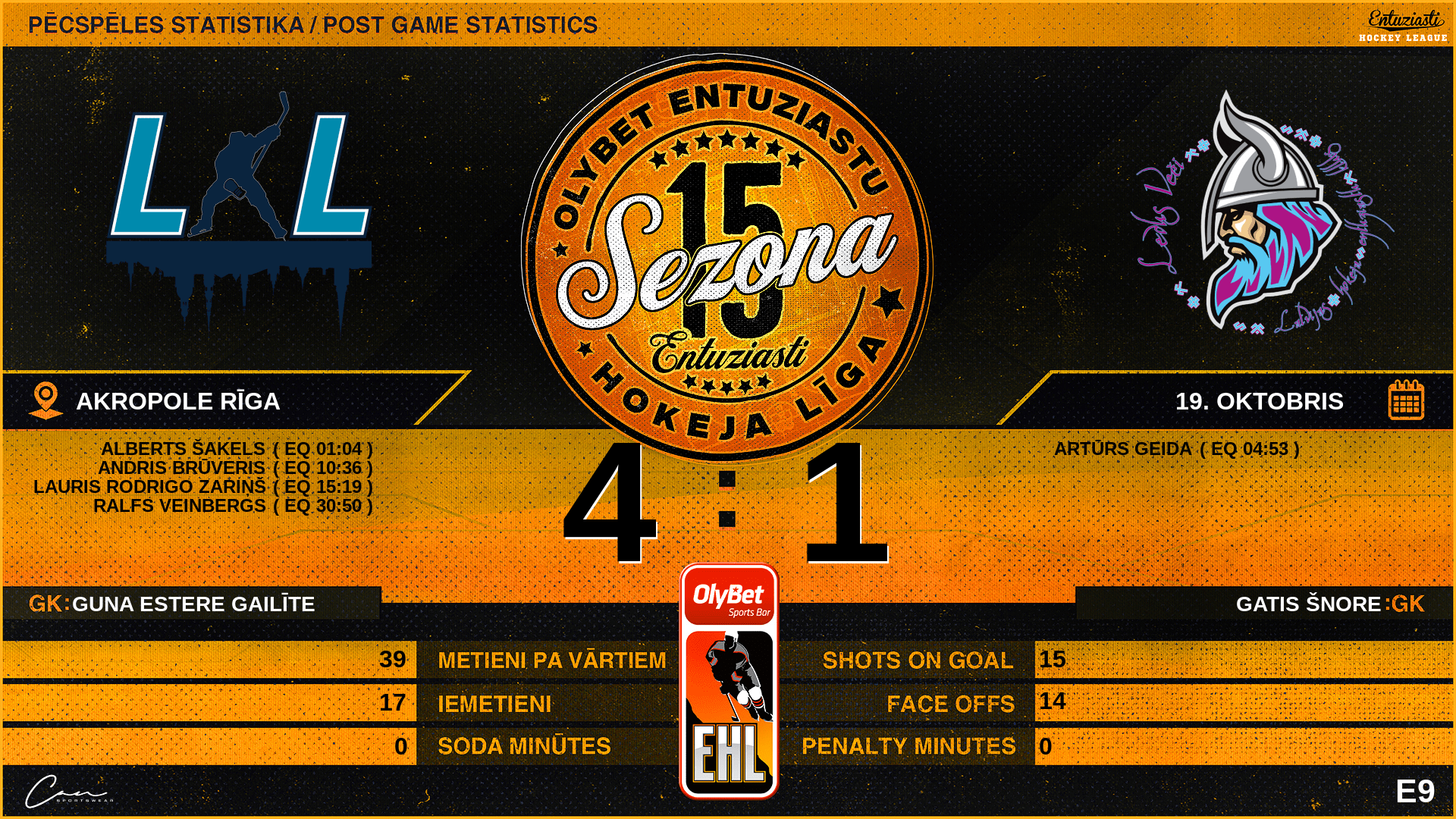 | 15:19 | LLS | Vārti (EQ) | #97 Lauris Rodrigo Zariņš, piespēles: #53 Oskars Pļavnieks, #54 Daiga Gavariņa |
