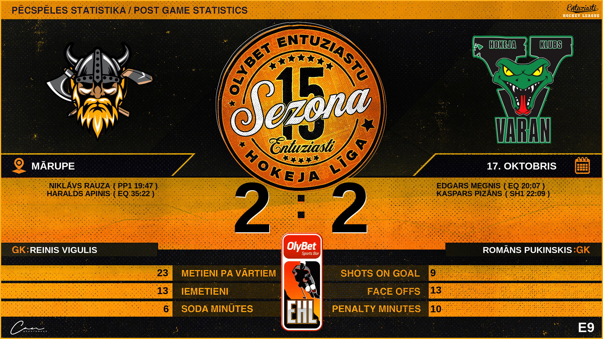 | 22:09 | VR2 | Vārti (SH1) | #3 Kaspars Pizāns, piespēles: #83 Mārtiņš Roze |