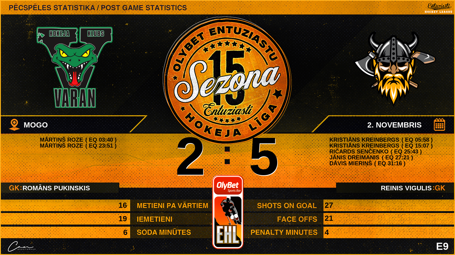 | 31:16 | VN3 | Vārti (EQ) | #17 Dāvis Mieriņš, piespēles: #32 Bruno Strupulis |