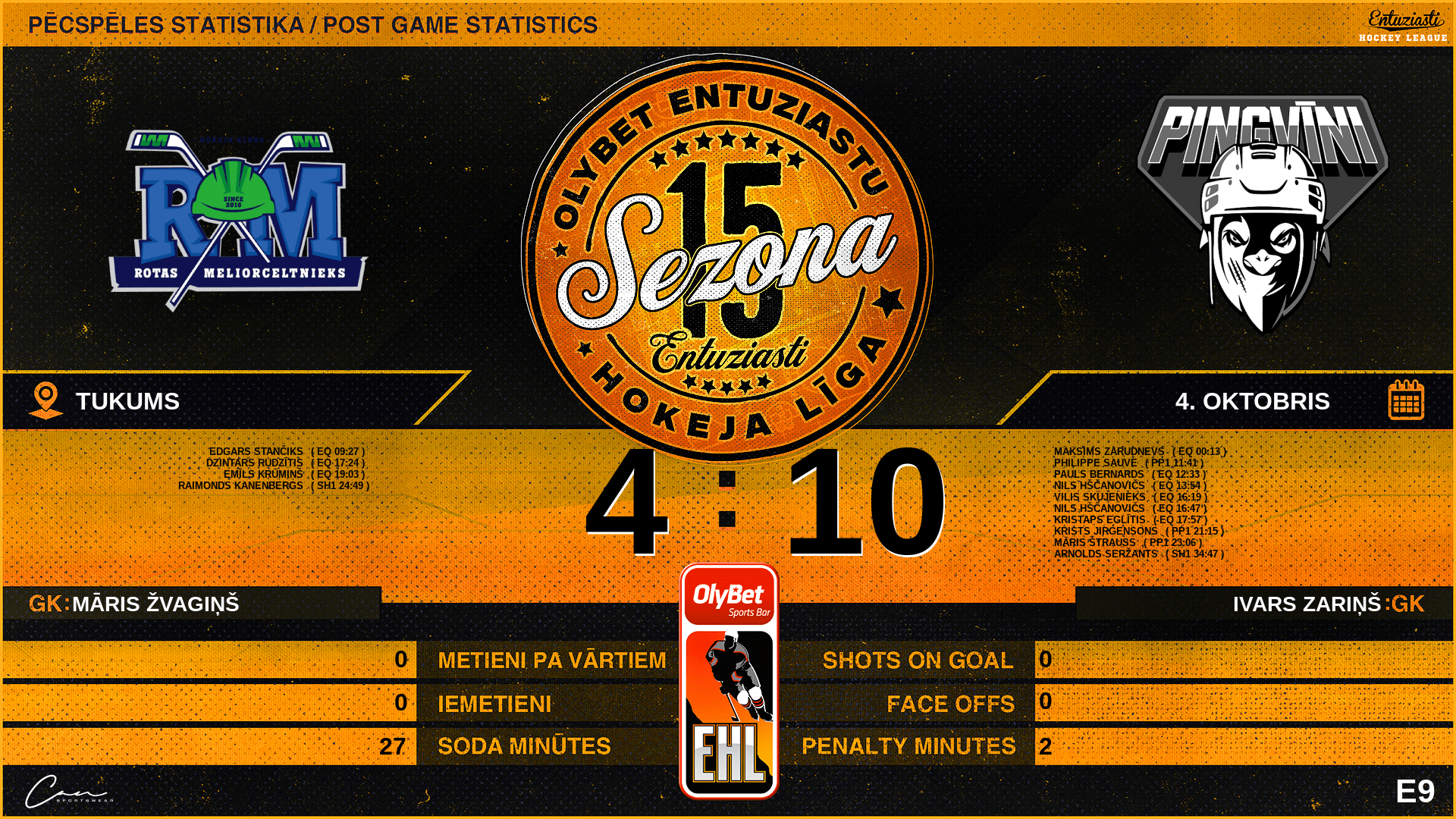 19:03 | RT3 | Vārti (EQ) | #10 Emīls Krūmiņš, piespēles: #51 Verners Černovs |