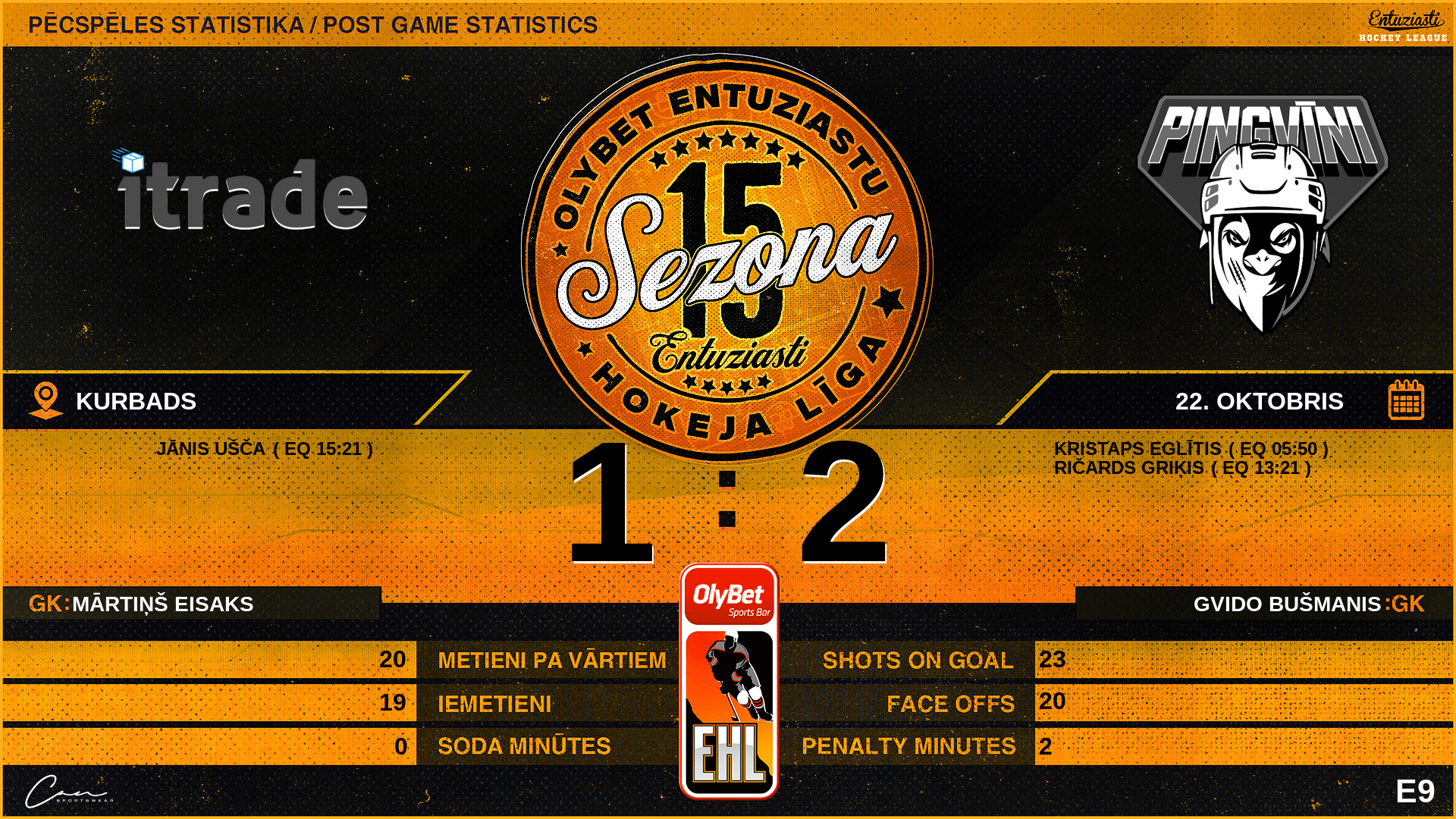 | 15:21 | ITR | Vārti (EQ) | #17 Jānis Ušča, piespēles: #56 Mārcis Martinsons |