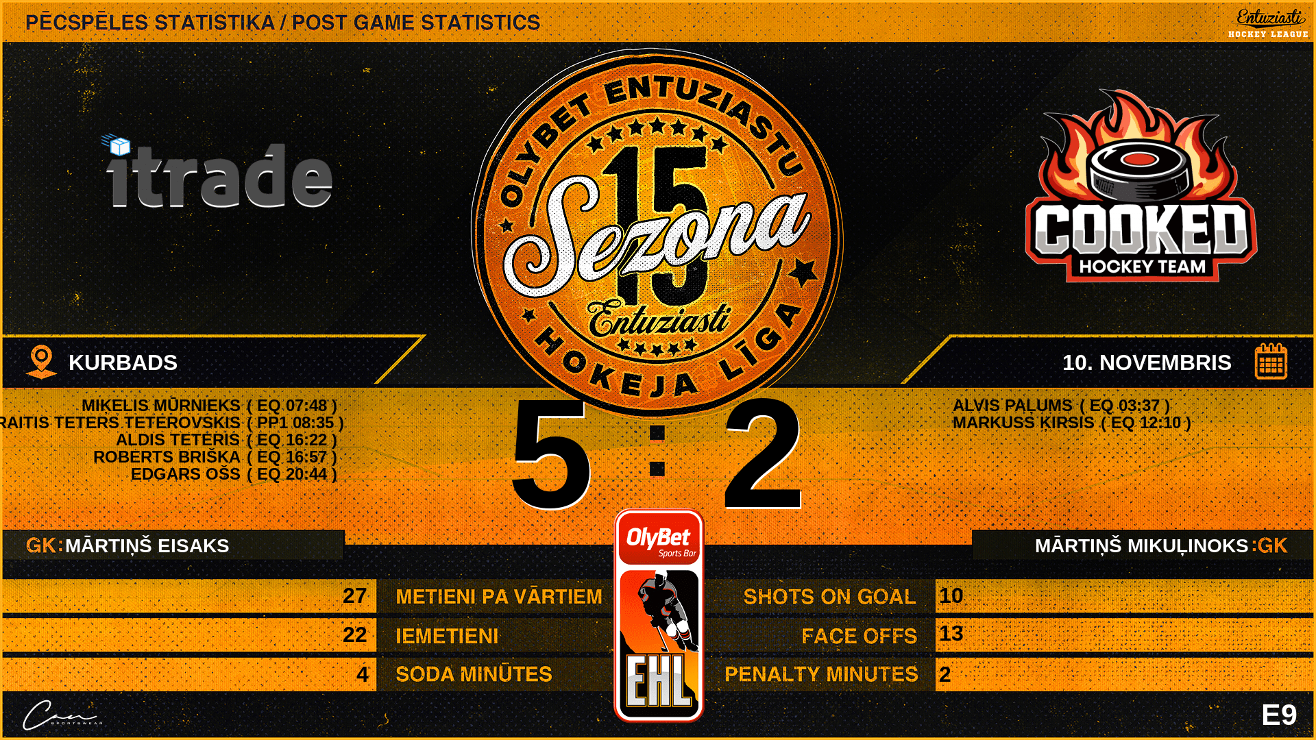 | 20:44 | ITR | Vārti (EQ) | #6 Edgars Ošs, piespēles: #7 Raitis Teters Teterovskis |