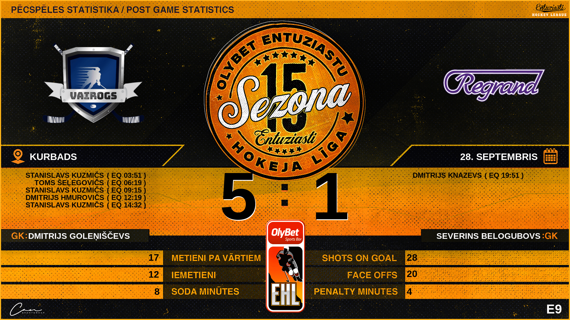 09:15 | VG2 | Vārti (EQ) | #5 Dmitrijs Hmurovičs, piespēles: #91 Stanislavs Kuzmičs, #53 Toms Šeļegovičs |