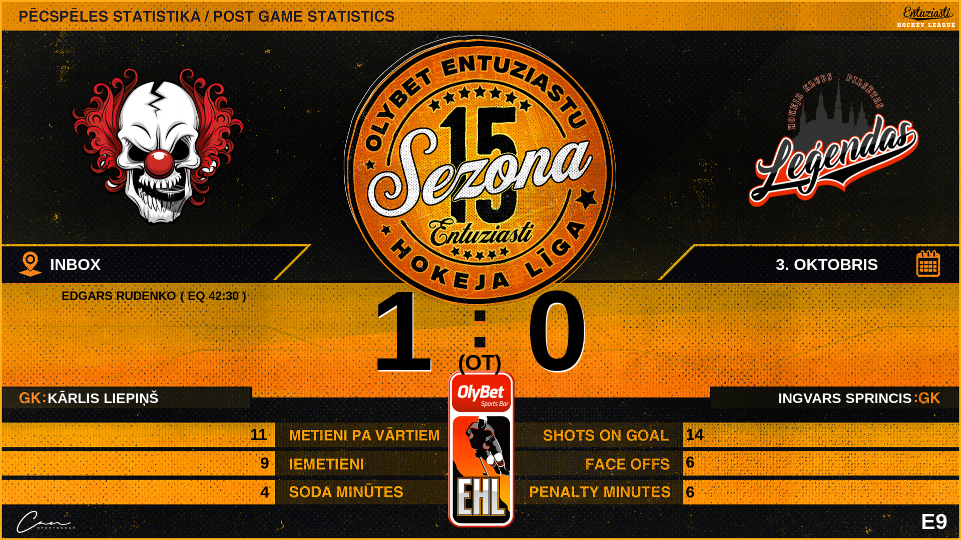 42:30 | CRK | Vārti (EQ) | #87 Edgars Rudenko, piespēles: #12 Reinis Rozenbergs, #9 Artūrs Stāmurs |