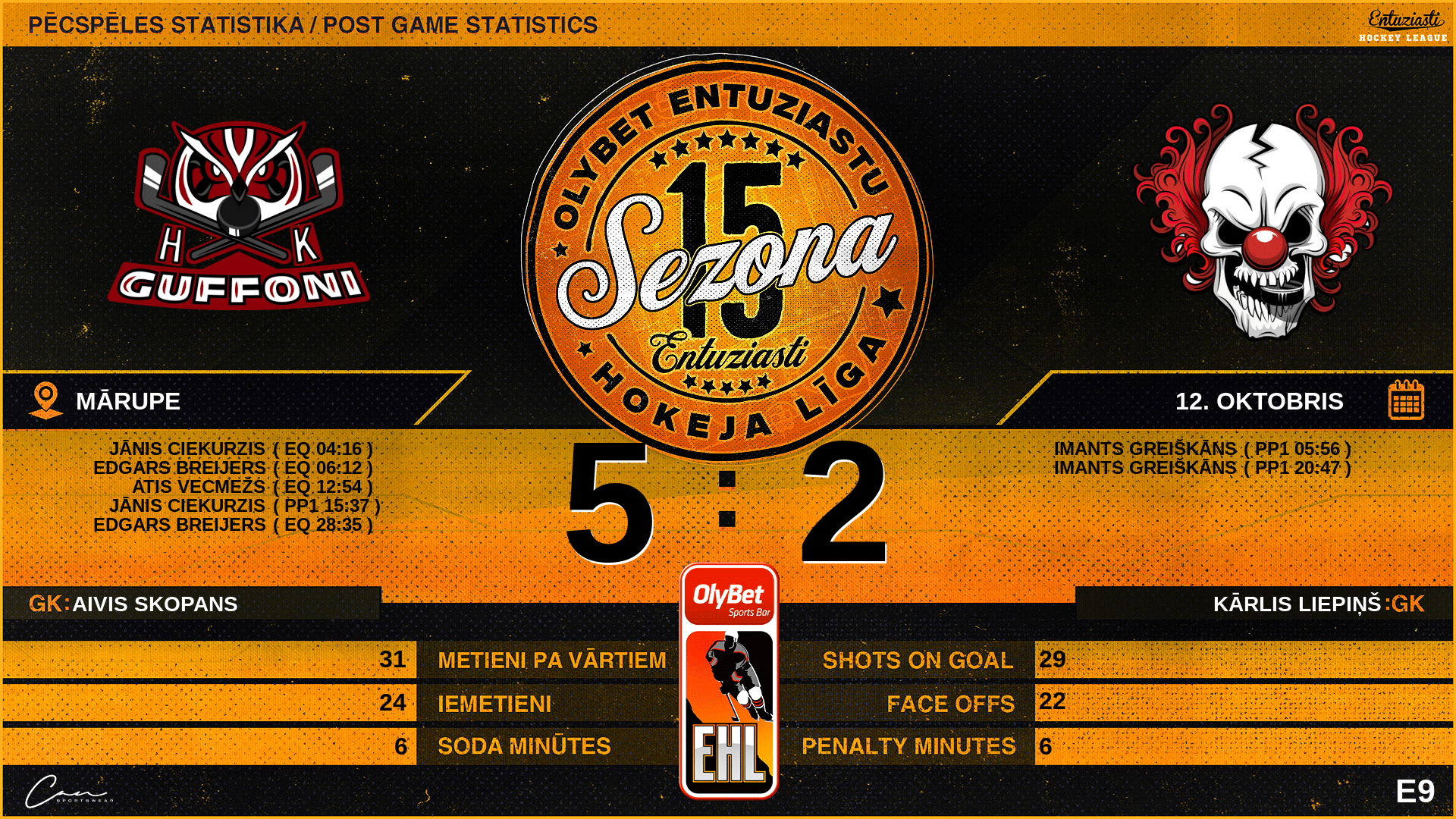 | 28:35 | GFN | Vārti (EQ) | #57 Edgars Breijers, piespēles: #17 Pauls Polencs, #23 Jānis Ciekurzis |