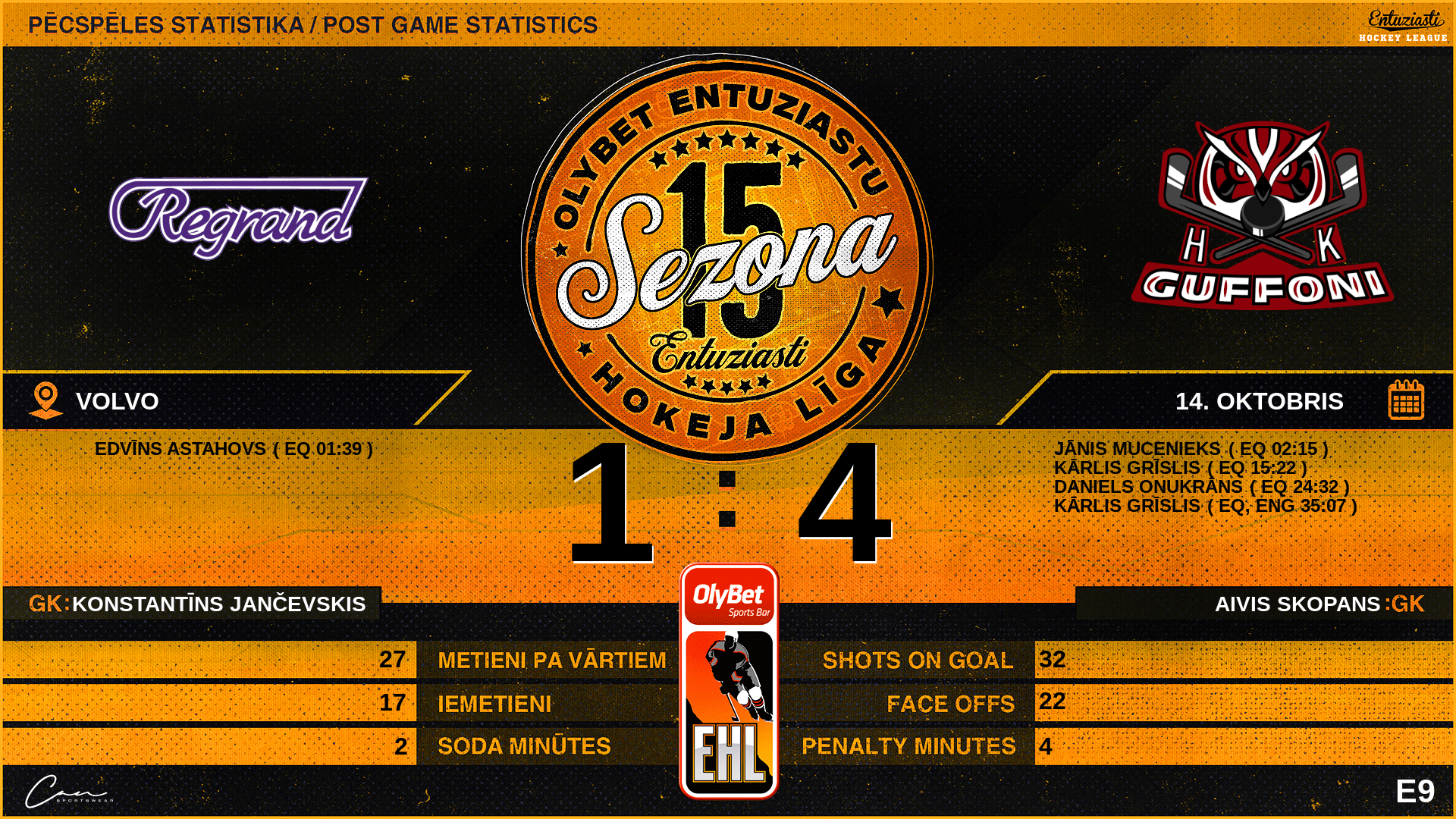 | 02:15 | GFN | Vārti (EQ) | #24 Jānis Mucenieks, piespēles: #57 Edgars Breijers, #23 Jānis Ciekurzis |