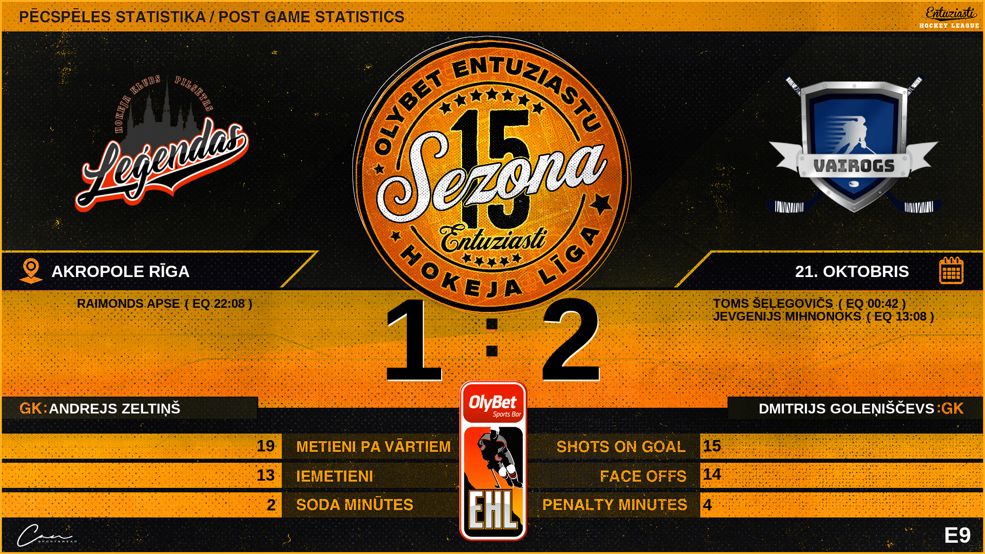 | 22:08 | PL9 | Vārti (EQ) | #57 Raimonds Apse, piespēles: #66 Pēteris Pavlovičs |