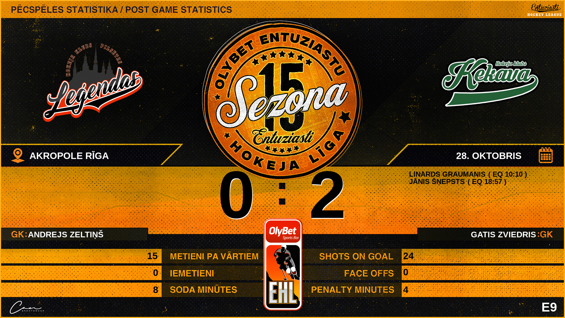 | 18:57 | ĶE5 | Vārti (EQ) | #66 Edgars Legzda, piespēles: #44 Jānis Tukišs, #88 Jānis Šņepsts |