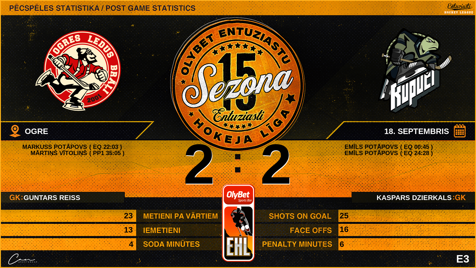 22:03 | OLB | Vārti (EQ) | #98 Markuss Potāpovs, piespēles: #16 Mārtiņš Vītoliņš, #27 Jānis Ķikāns |