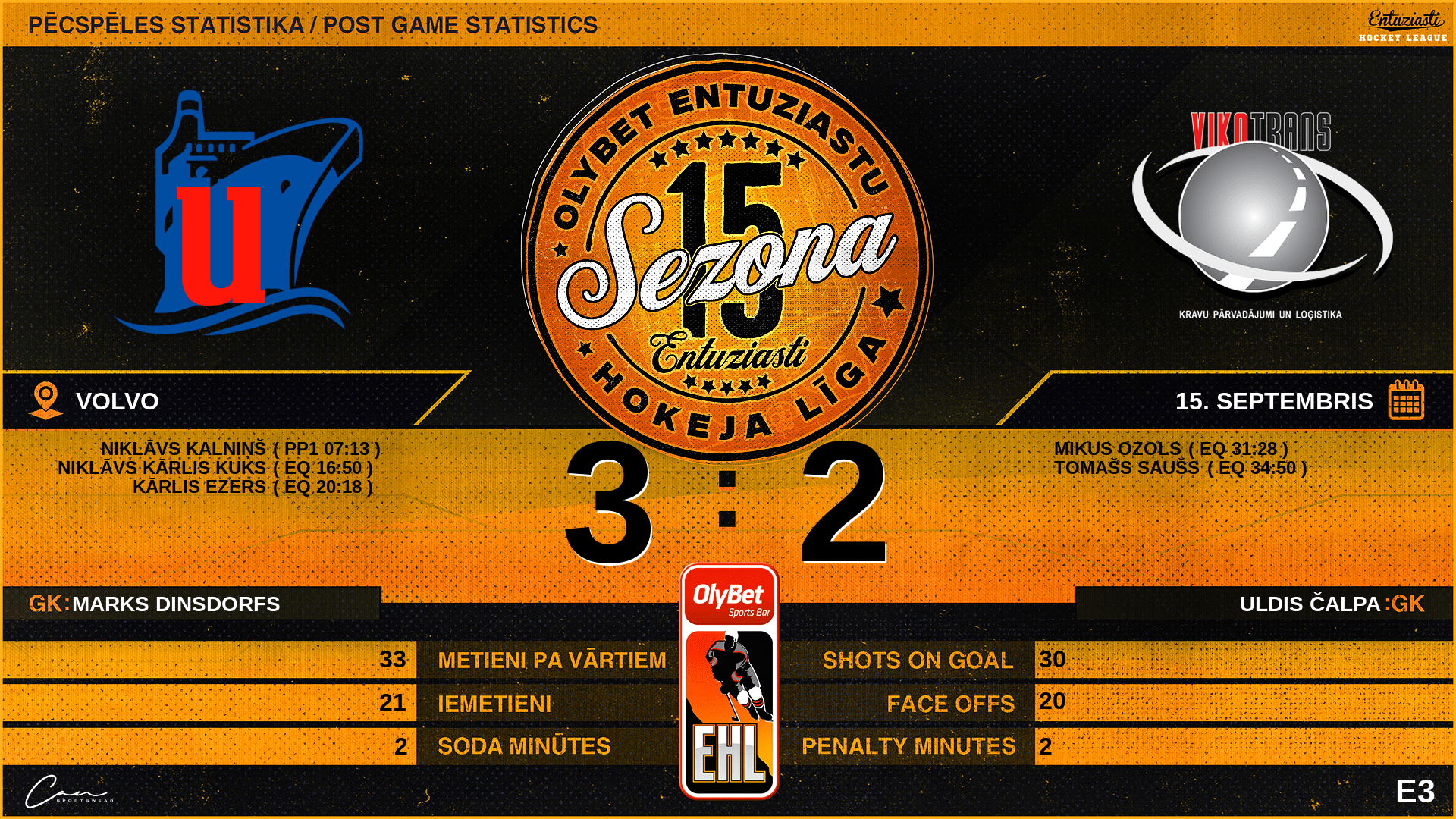 20:18 | UNI | Vārti (EQ) | #77 Kārlis Ezers, piespēles: #25 Henrijs Uzraugs |