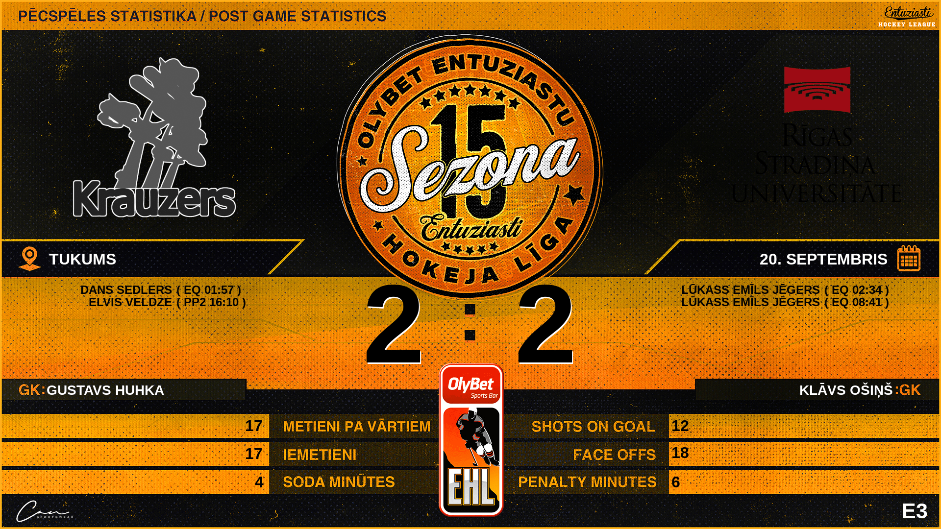 02:34 | RSU | Vārti (EQ) | #31 Lūkass Emīls Jēgers, piespēles: #8 Mairis Krustiņš |