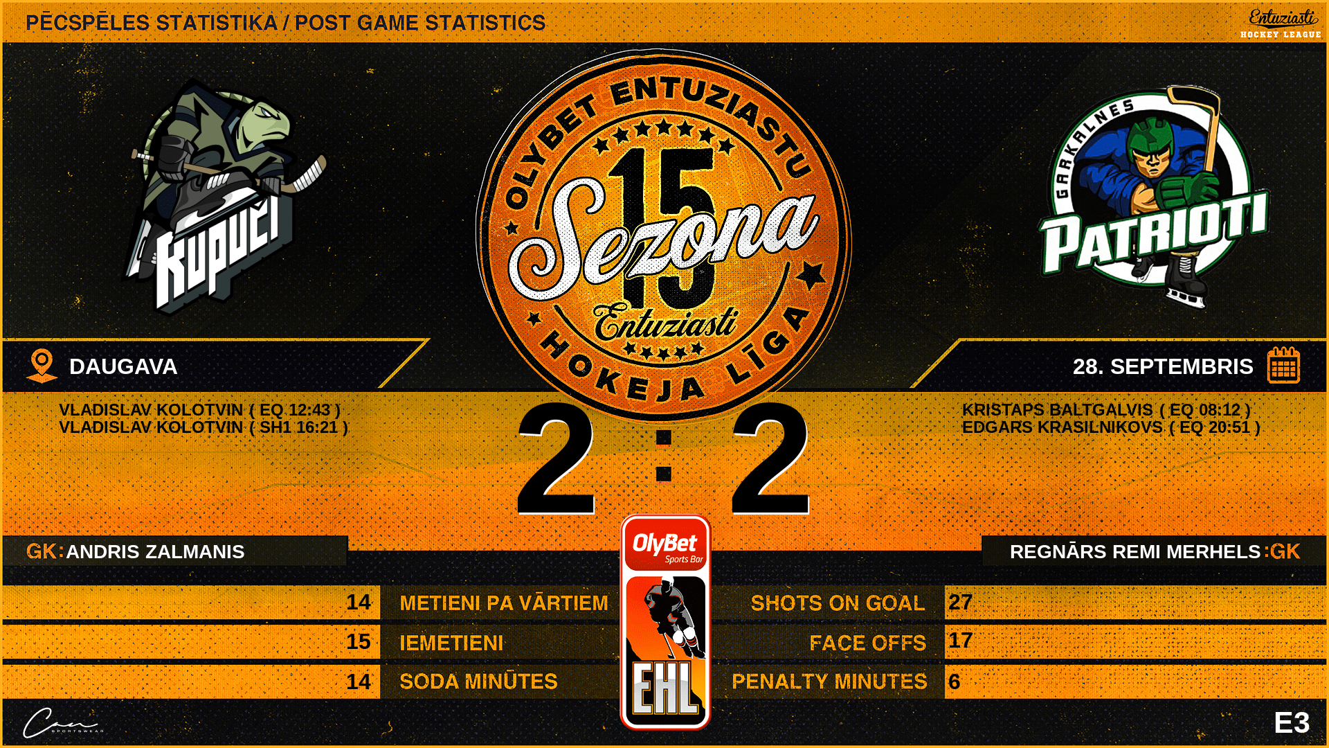 20:51 | GP2 | Vārti (EQ) | #21 Edgars Krasilnikovs, piespēles: #81 Kristaps Baltgalvis, #7 Gustavs Gauja |