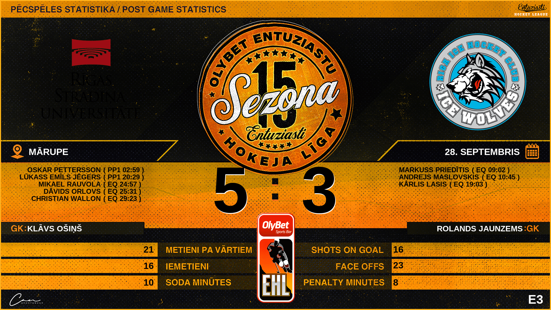 25:31 | RSU | Vārti (EQ) | #9 Dāvids Orlovs, piespēles: #56 Lūkass Emīls Jēgers, #42 Eerikki Hattula |