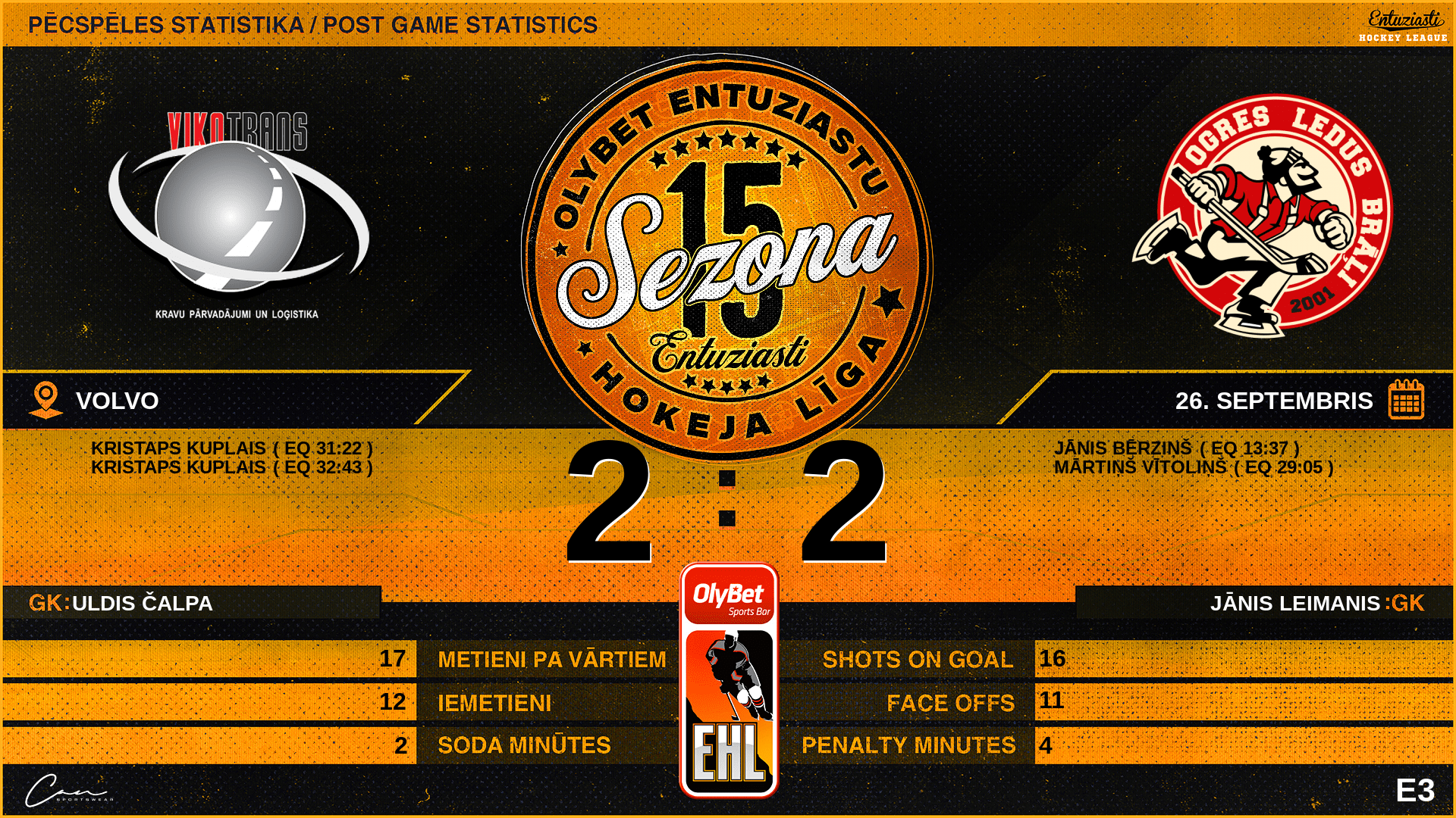 31:22 | VKT | Vārti (EQ) | #70 Kristaps Kuplais, piespēles: #7 Kristaps Veršūns, #50 Silvestrs Kūliņš |