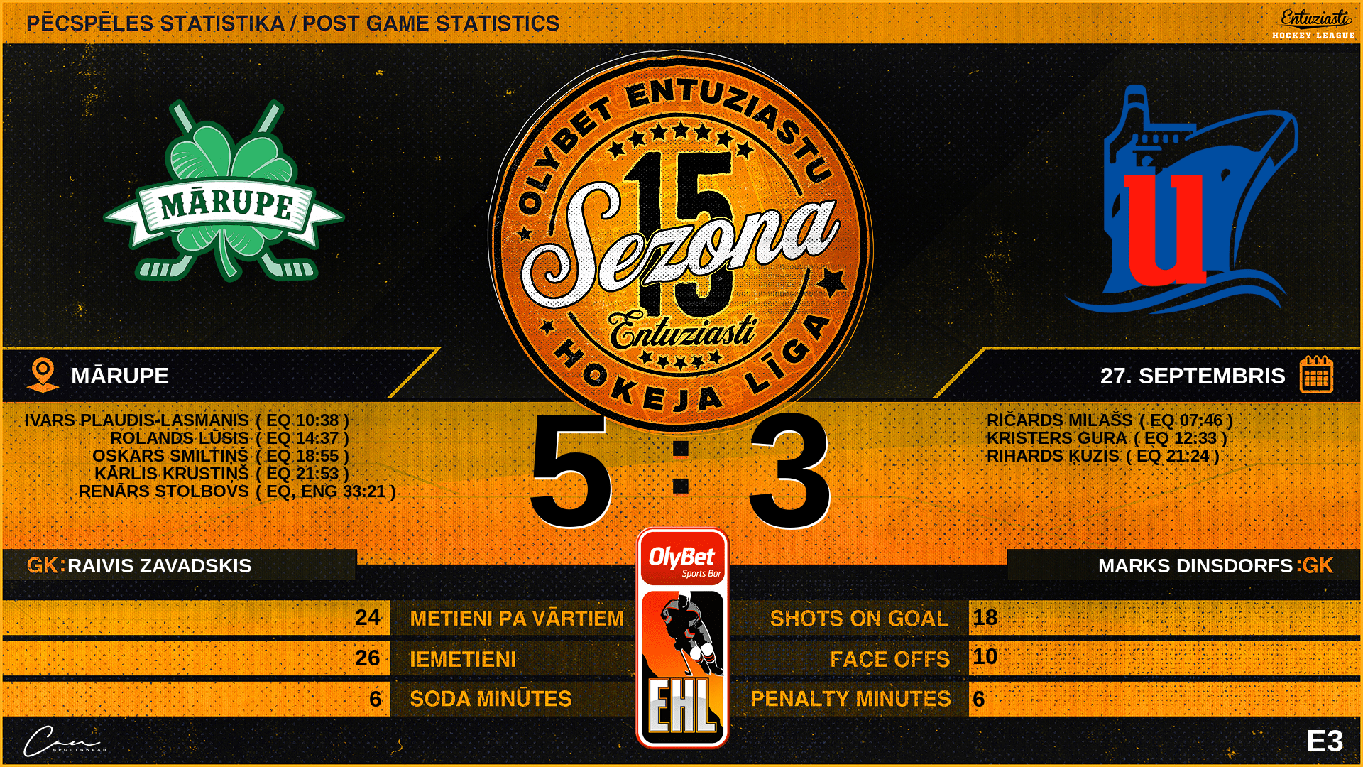 18:55 | MRP | Vārti (EQ) | #17 Oskars Smiltiņš, piespēles: #15 Rolands Lūsis, #28 Kārlis Krustiņš |