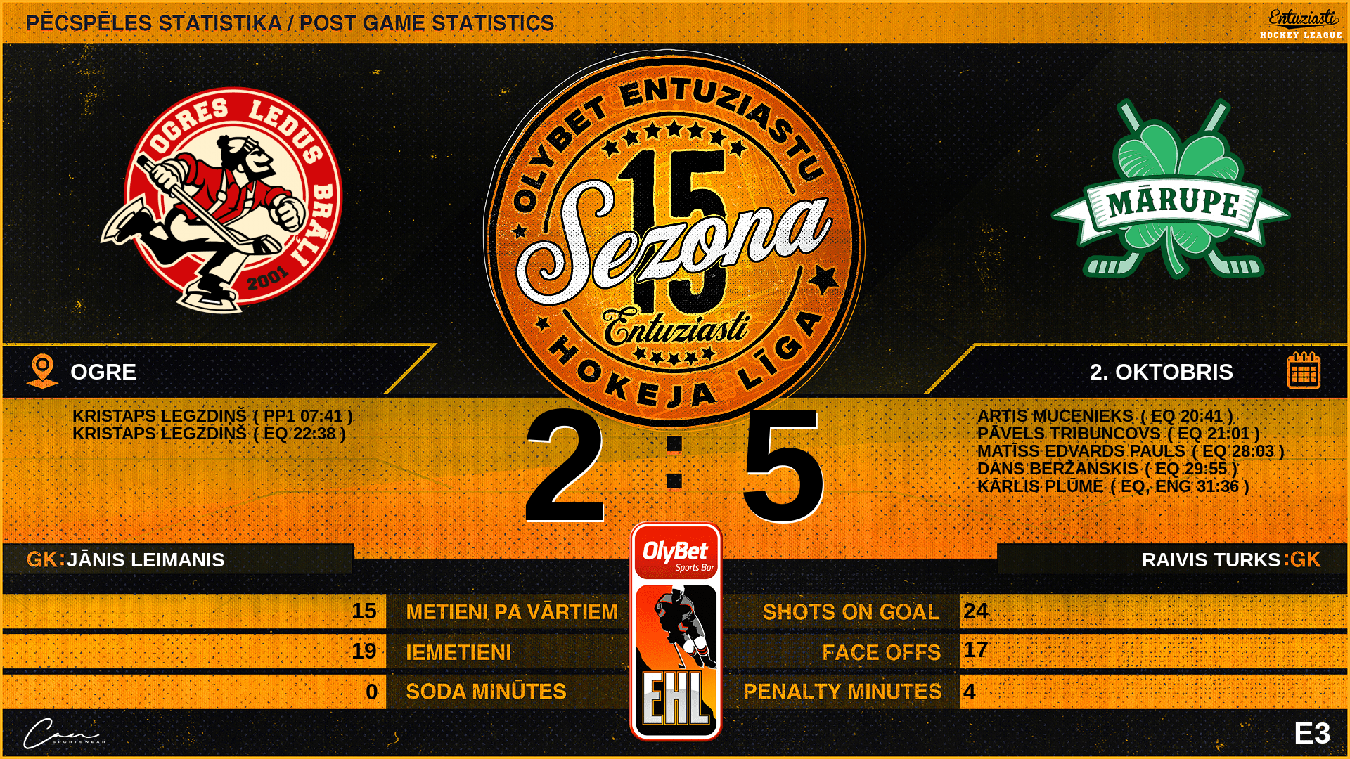 22:38 | OLB | Vārti (EQ) | #90 Kristaps Legzdiņš, piespēles: #92 Jānis Bērziņš, #9 Mārtiņš Silavs |