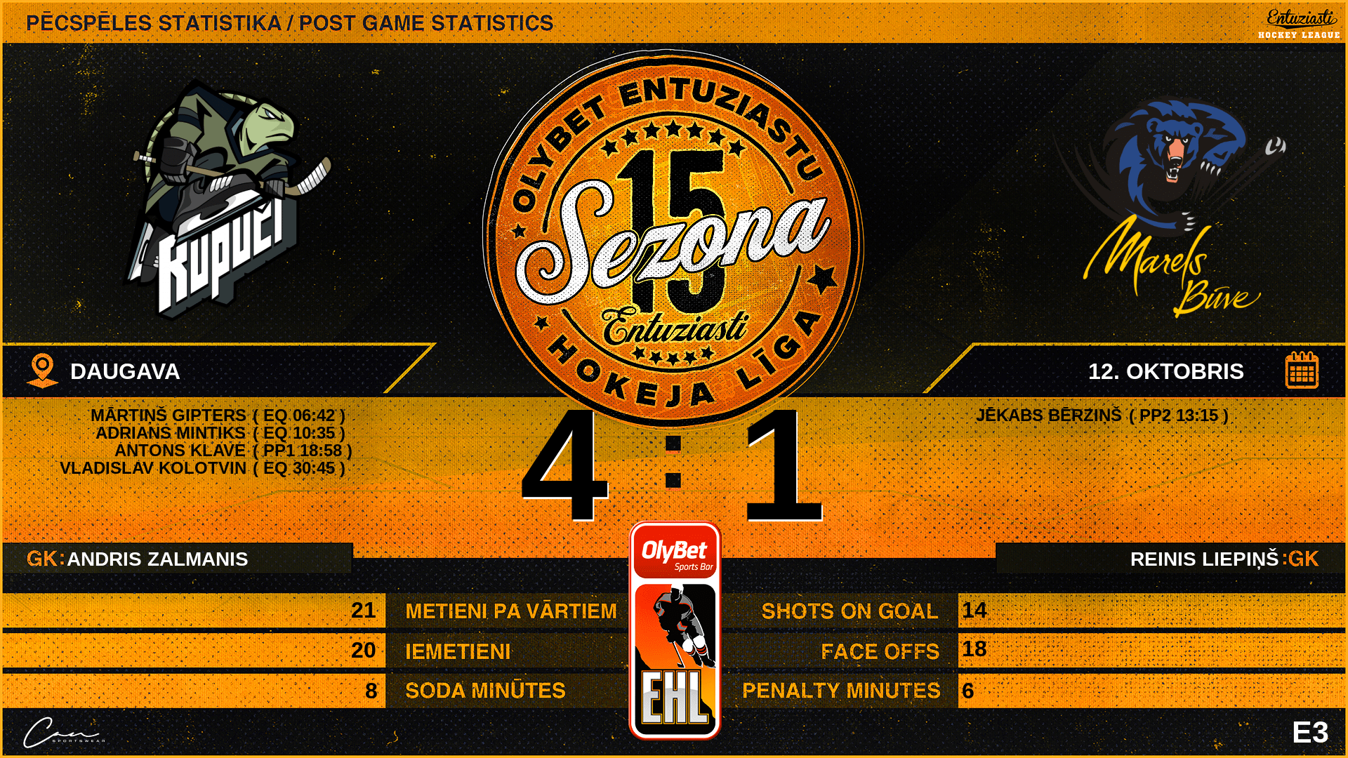 | 13:15 | MBV | Vārti (PP2) | #20 Jēkabs Bērziņš, piespēles: #91 Dāvids Krūmiņš, #21 Ingus Matiņš |
