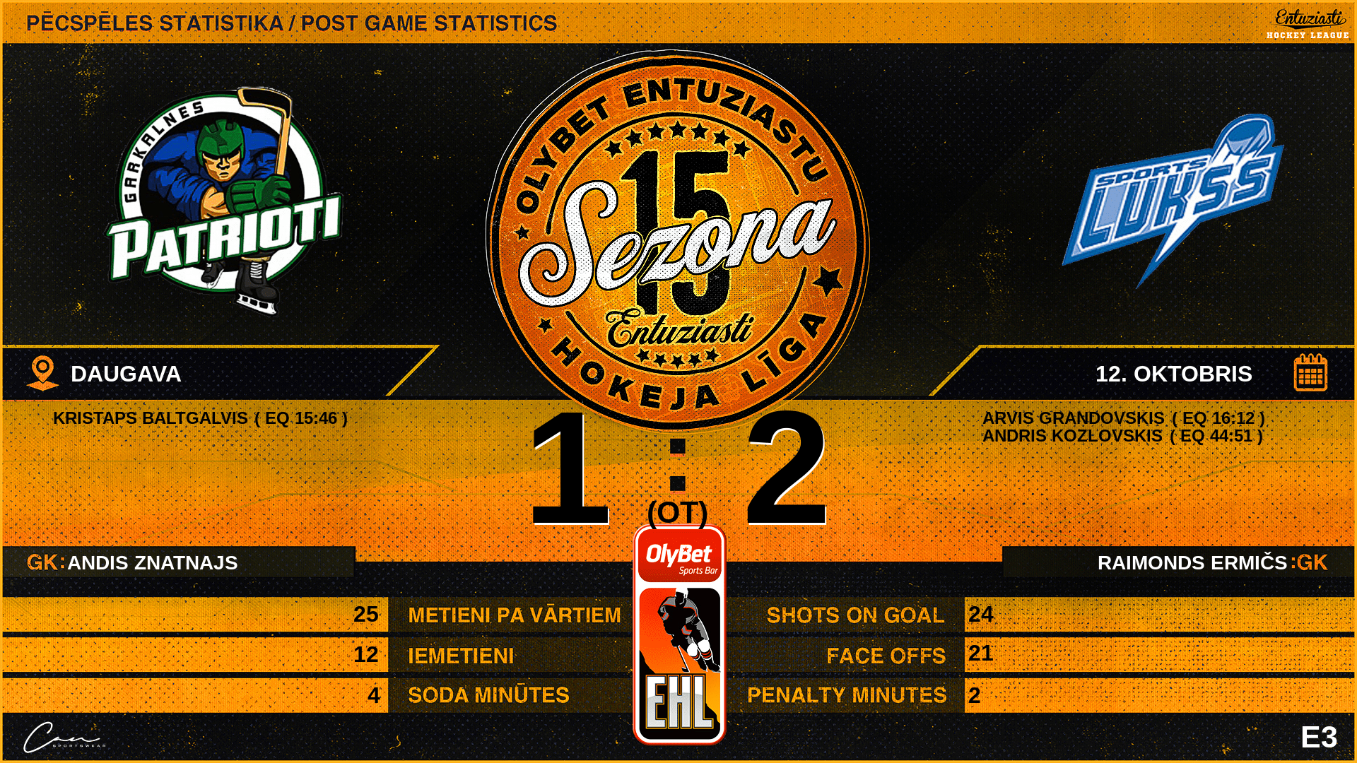 | 15:46 | GP2 | Vārti (EQ) | #81 Kristaps Baltgalvis, piespēles: #15 Nils Nikolajevs, #21 Edgars Krasilnikovs |
