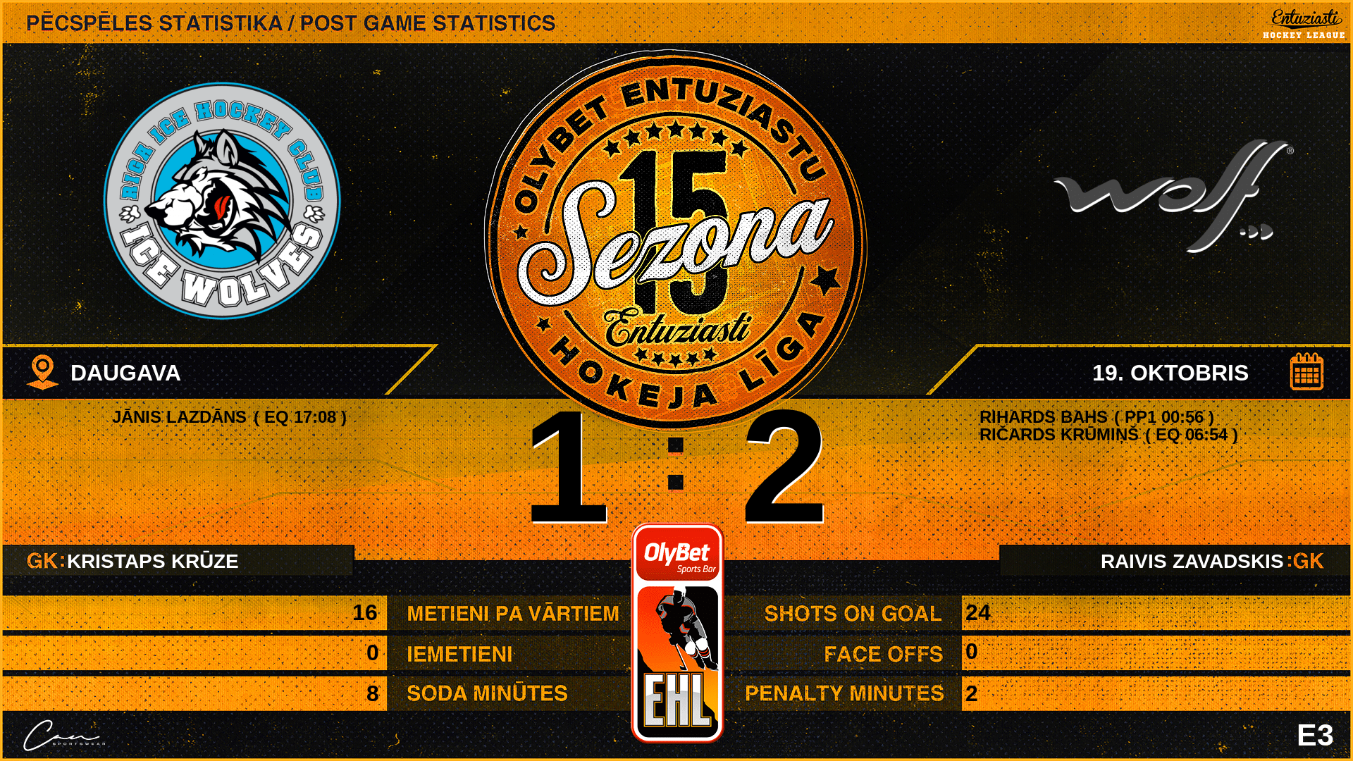 | 17:08 | WLF | Vārti (EQ) | #29 Jānis Lazdāns, piespēles: #75 Ņikita Krilovs, #7 Kārlis Lasis |