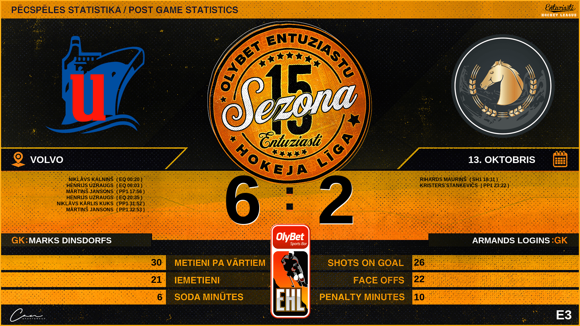 | 32:53 | UNI | Vārti (EQ) | #7 Mārtiņš Jansons, piespēles: #25 Henrijs Uzraugs, #2 Ingus Turks |