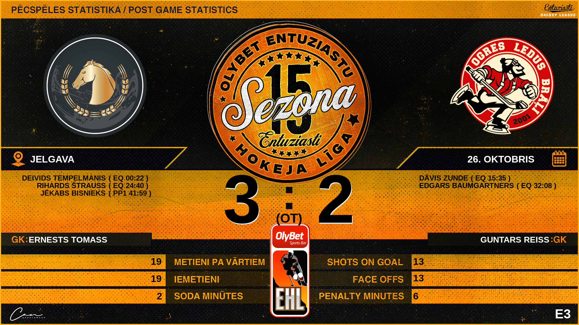 | 32:08 | OLB | Vārti (EQ) | #29 Edgars Baumgartners, piespēles: #26 Nauris Audijāns, #51 Dāvis Zunde |