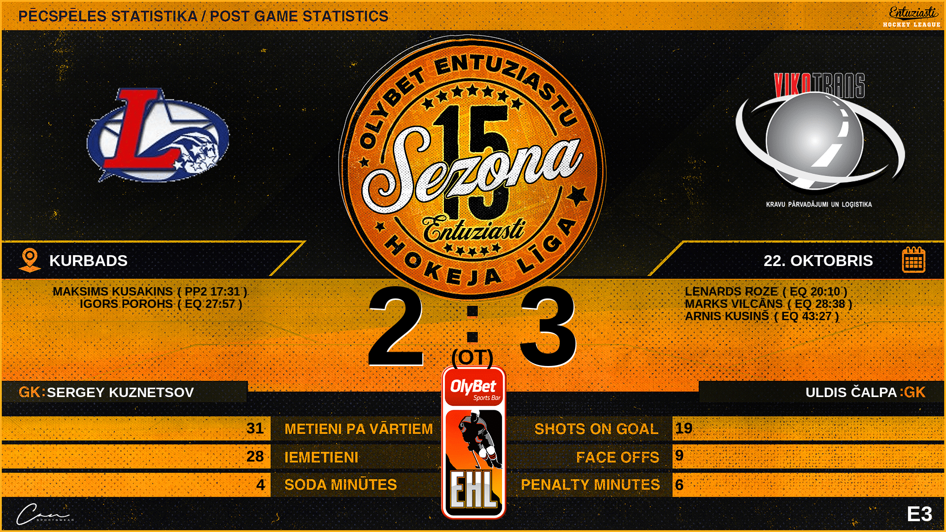 | 28:38 | VKT | Vārti (EQ) | #17 Marks Vilcāns, piespēles: #7 Kristaps Veršūns, #15 Romāns Vitkalovs |