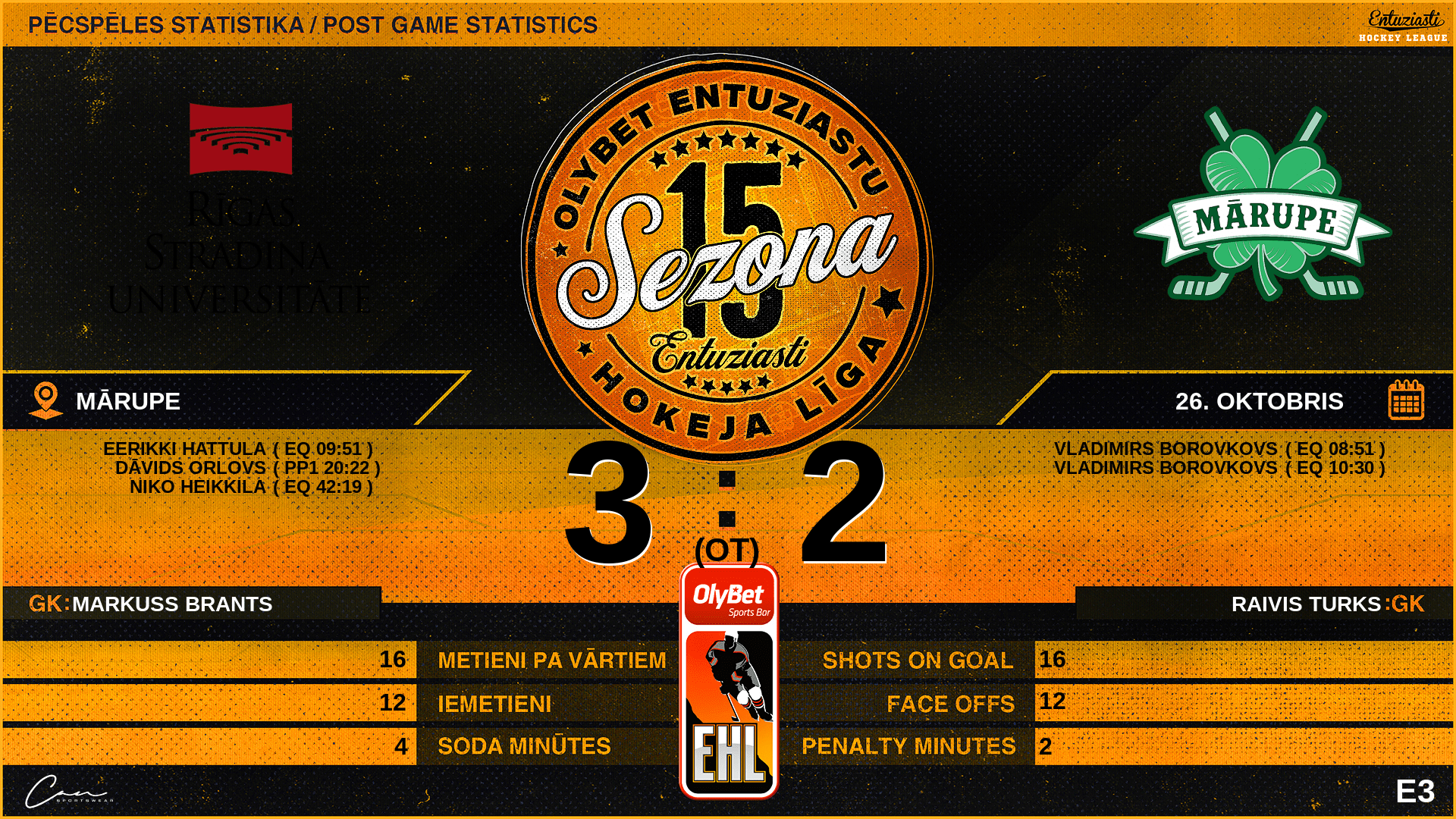 | 08:51 | MRP | Vārti (EQ) | #28 Vladimirs Borovkovs, piespēles: #88 Dans Beržanskis, #91 Artis Mucenieks |
