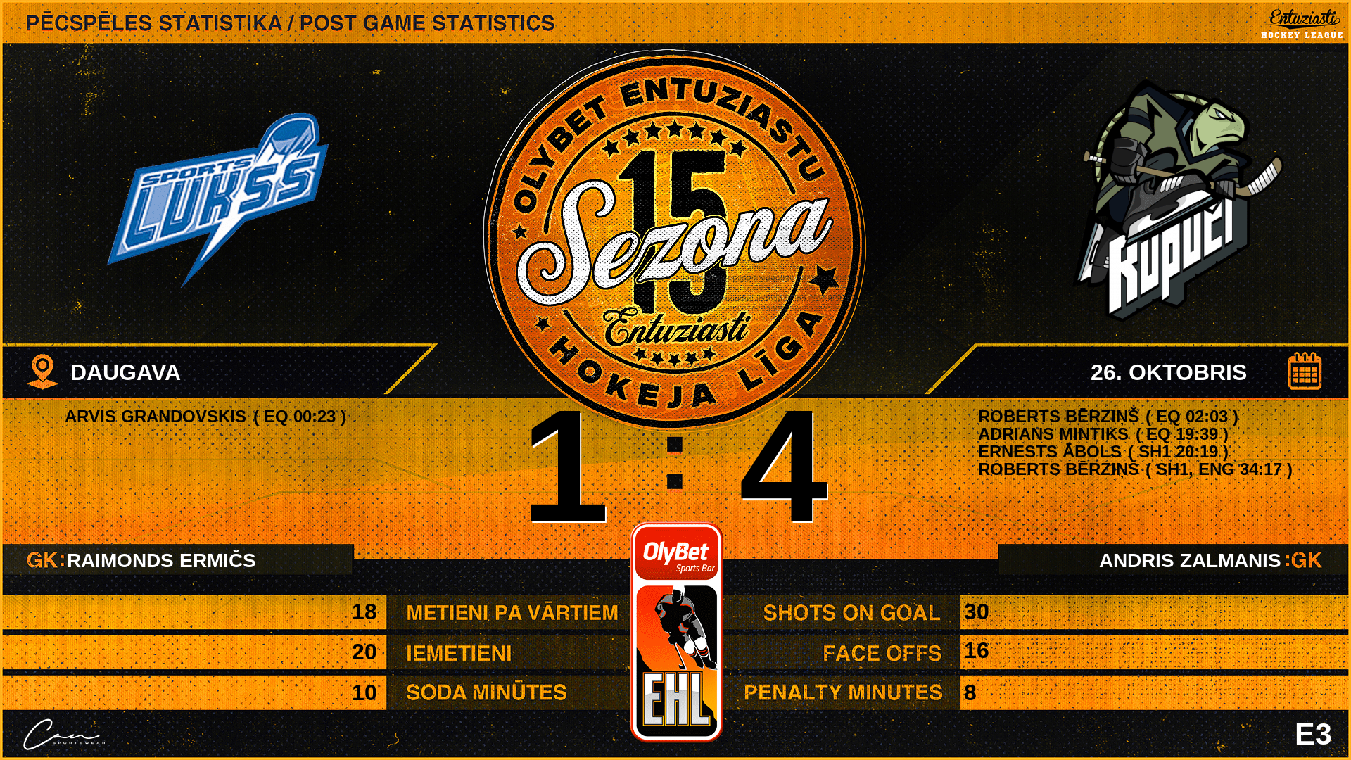 | 19:39 | RPC | Vārti (EQ) | #91 Adrians Mintiks, piespēles: #16 Mārtiņš Roštoks |