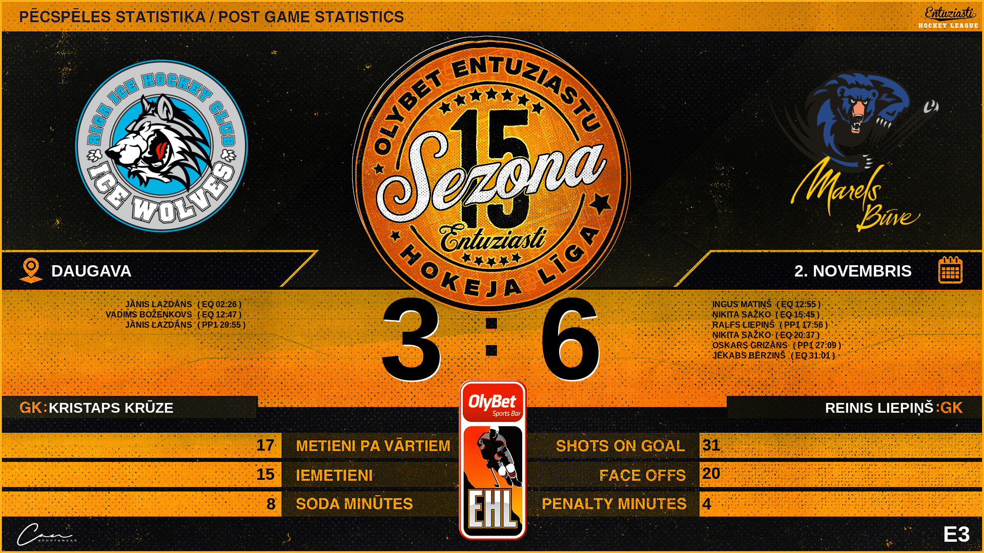 | 29:55 | WLF | Vārti (PP1) | #29 Jānis Lazdāns, piespēles: #7 Kārlis Lasis, #19 Reinis Vītoliņš |
