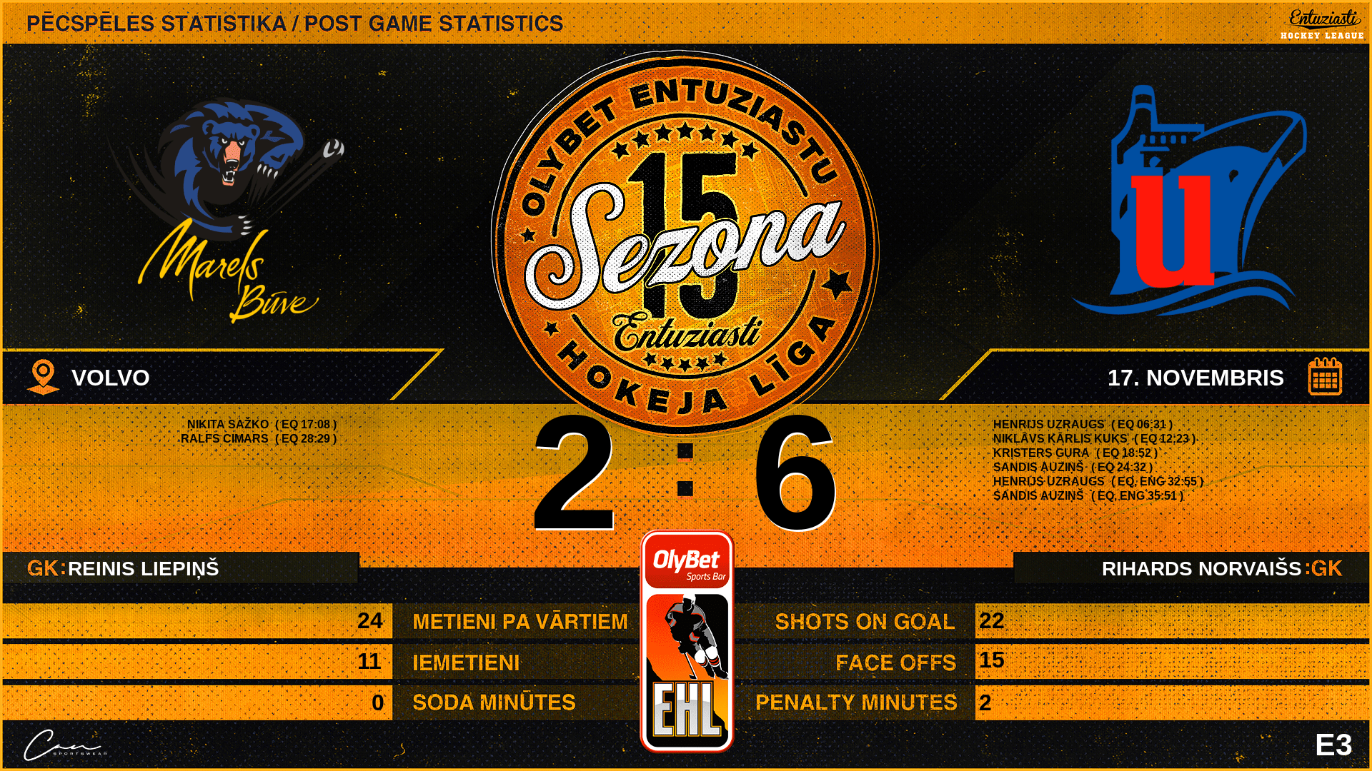 | 17:08 | MBV | Vārti (EQ) | #77 Ņikita Sažko, piespēles: #7 Ēriks Roberts Rūsis, #21 Ingus Matiņš |