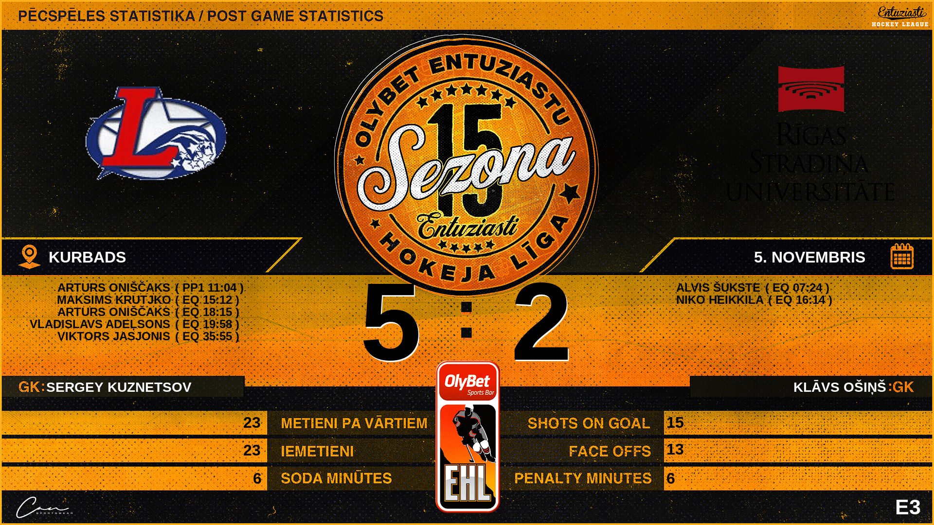 | 07:24 | RSU | Vārti (EQ) | #10 Alvis Šukste, piespēles: #31 Kristiāns Upmalis |