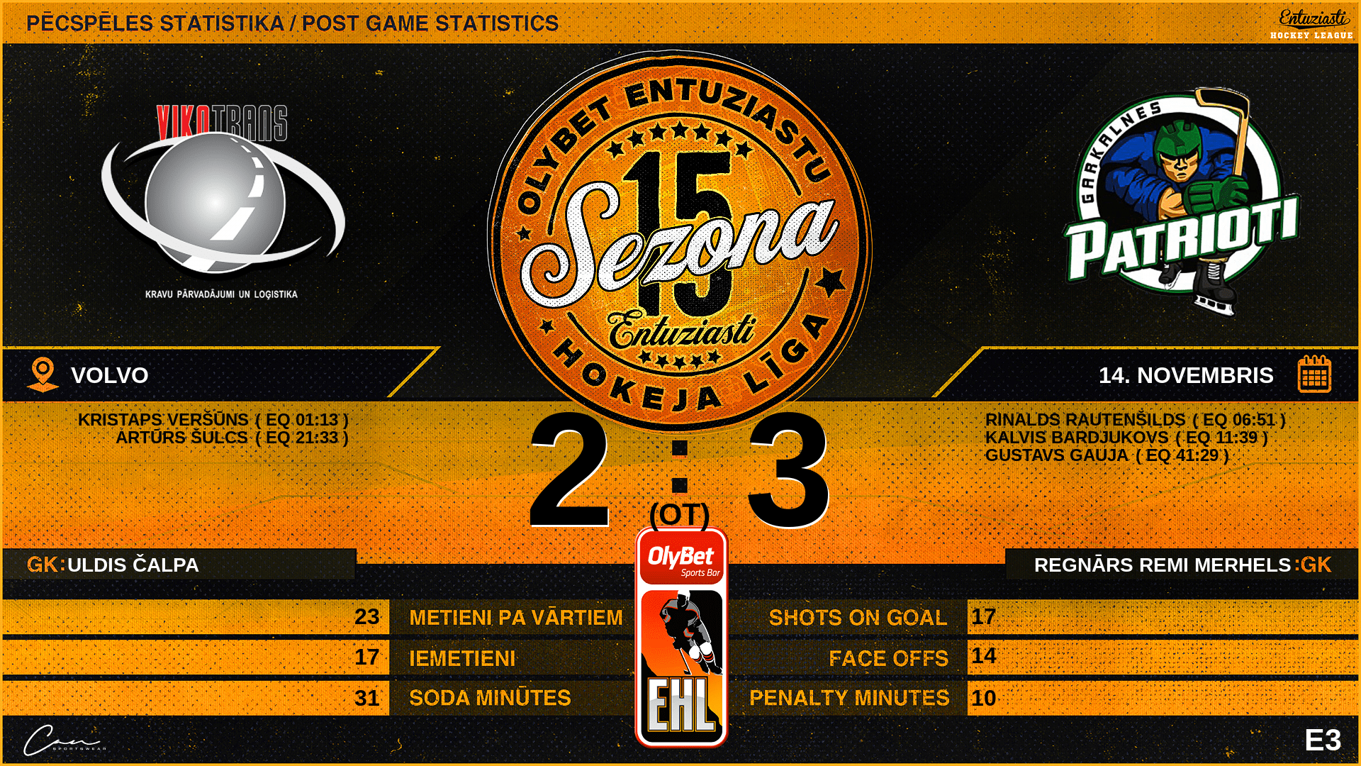 | 11:39 | GP2 | Vārti (EQ) | #44 Kalvis Bardjukovs, piespēles: #93 Rinalds Rautenšilds, #21 Edgars Krasilnikovs |