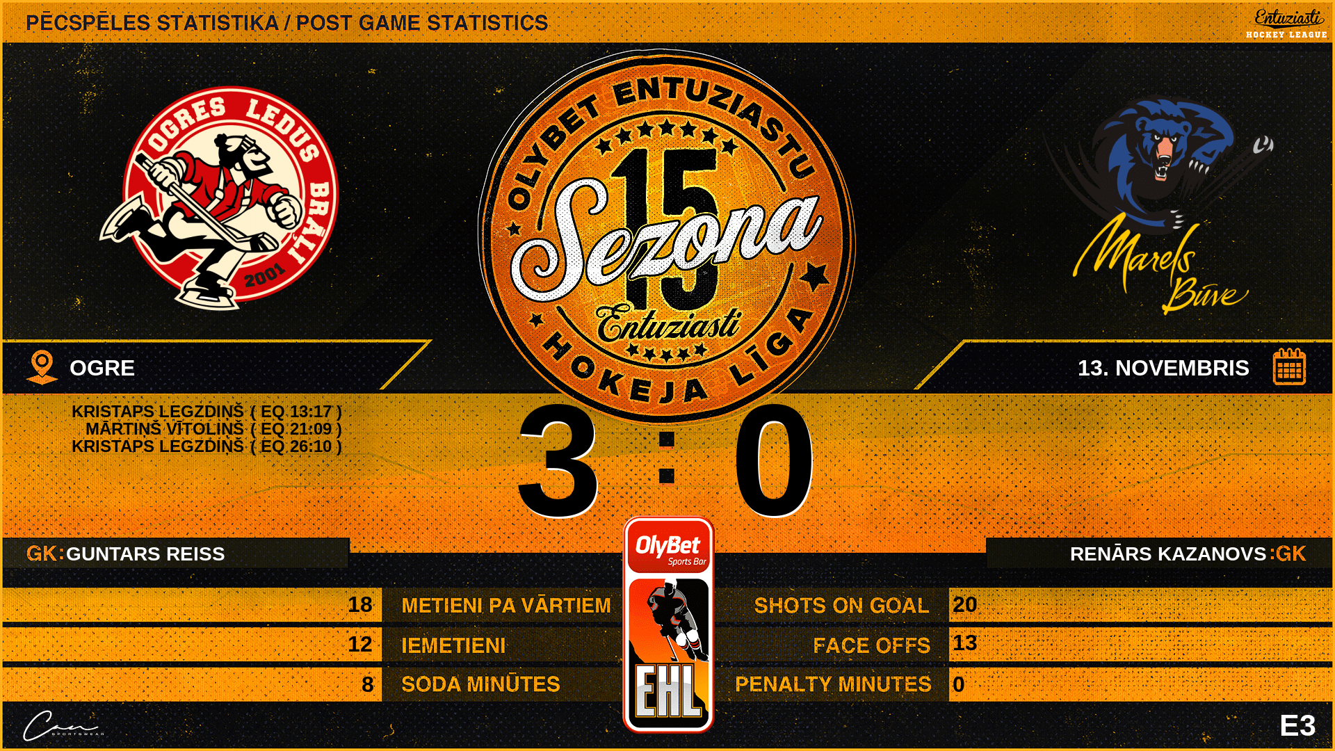 | 13:17 | OLB | Vārti (EQ) | #90 Kristaps Legzdiņš, piespēles: #92 Jānis Bērziņš |