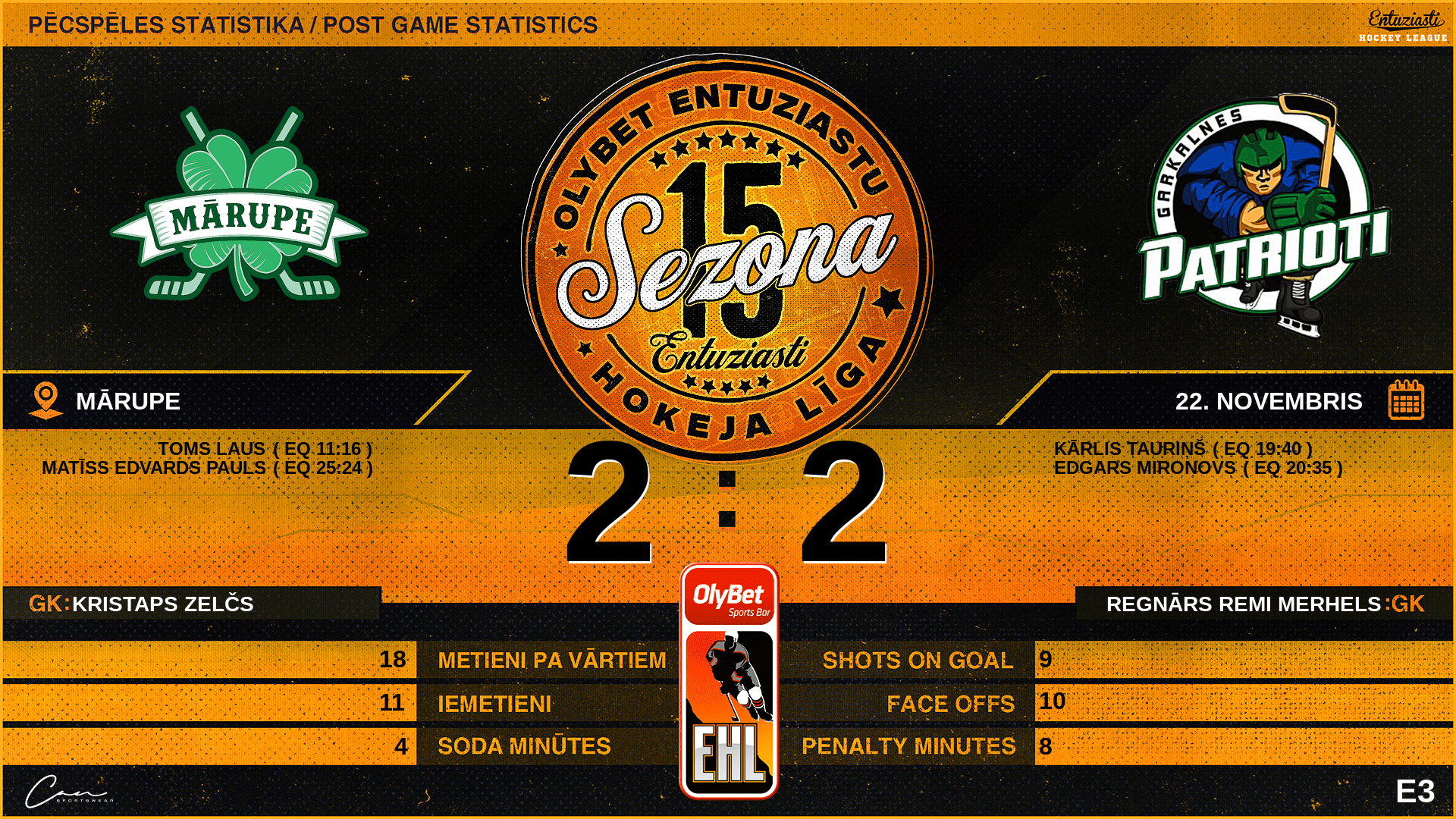 | 20:35 | GP2 | Vārti (EQ) | #40 Edgars Mironovs, piespēles: #15 Nils Nikolajevs |