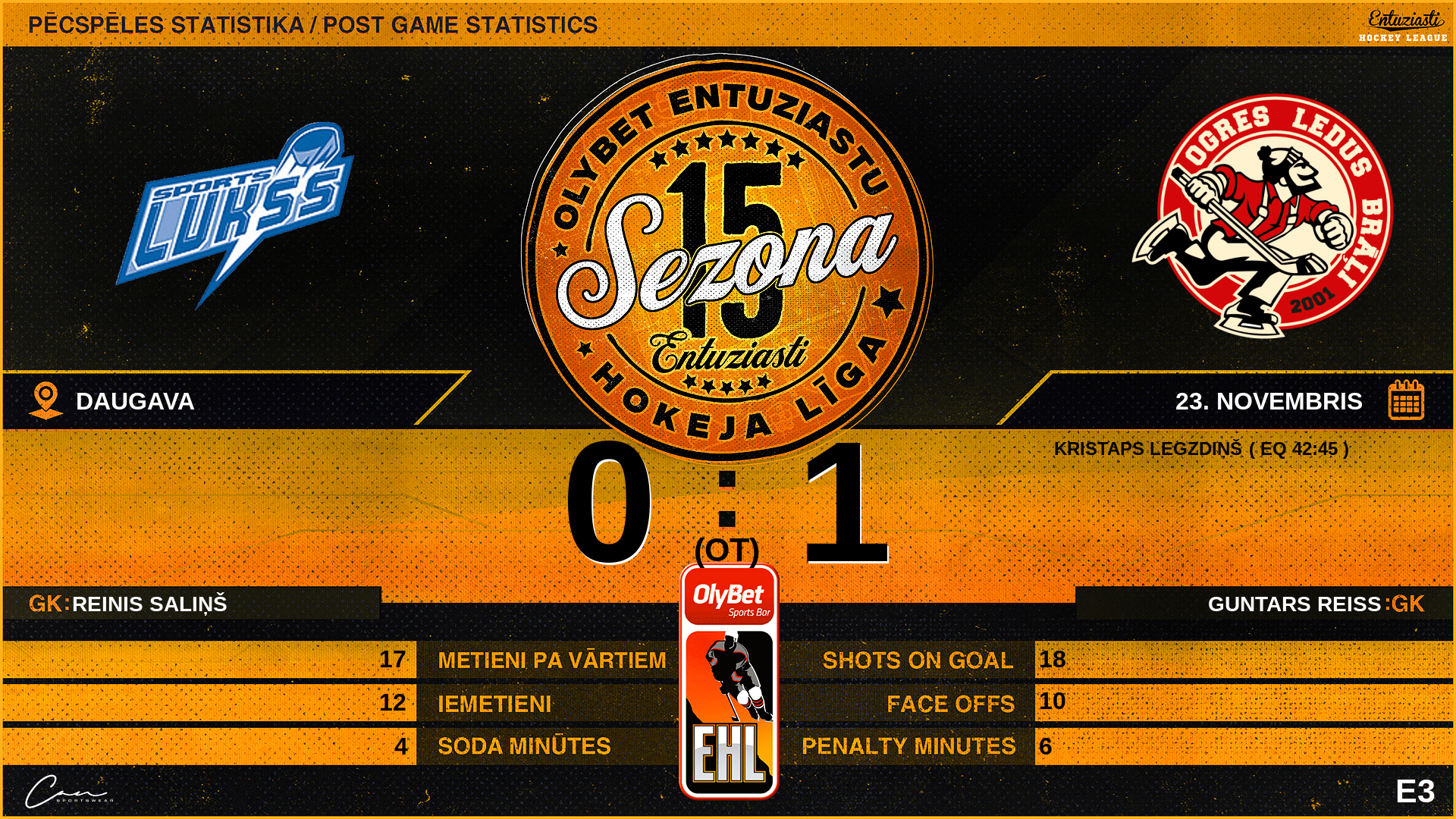 | 42:45 | OLB | Vārti (EQ) | #19 Kristaps Legzdiņš, piespēles: #18 Kaspars Alekss Krustiņš, #96 Guntars Reiss |