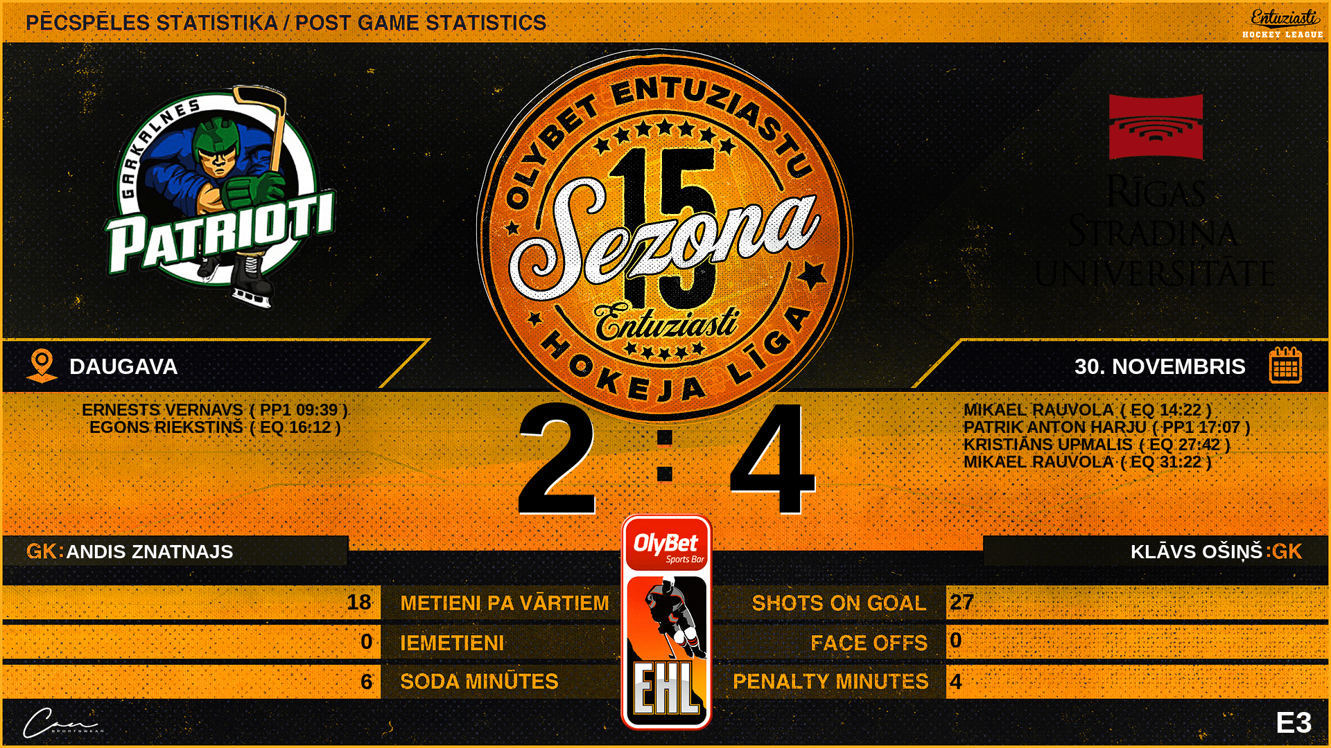 | 27:42 | RSU | Vārti (EQ) | #31 Kristiāns Upmalis, piespēles: #24 Sivert Berland, #56 Lūkass Emīls Jēgers |